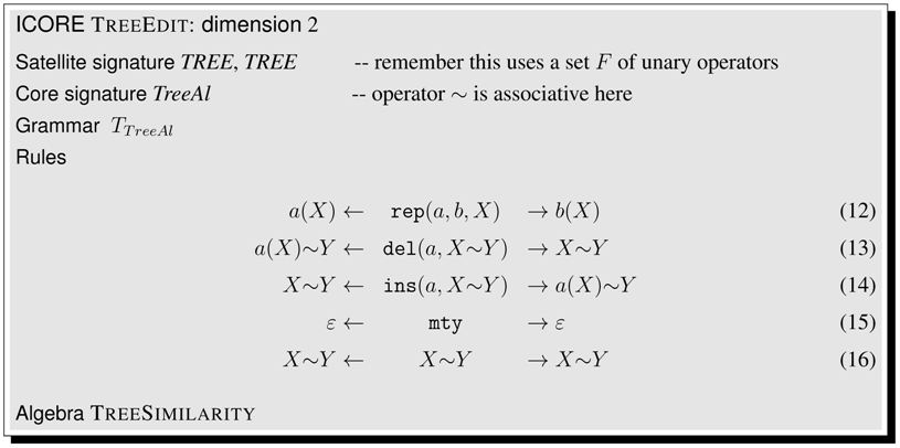 means that we search for the edit script of minimal cost. Under interpretation by algebra UnitScore, our example core term c evaluates to a score of 3 (which happens to be optimal).