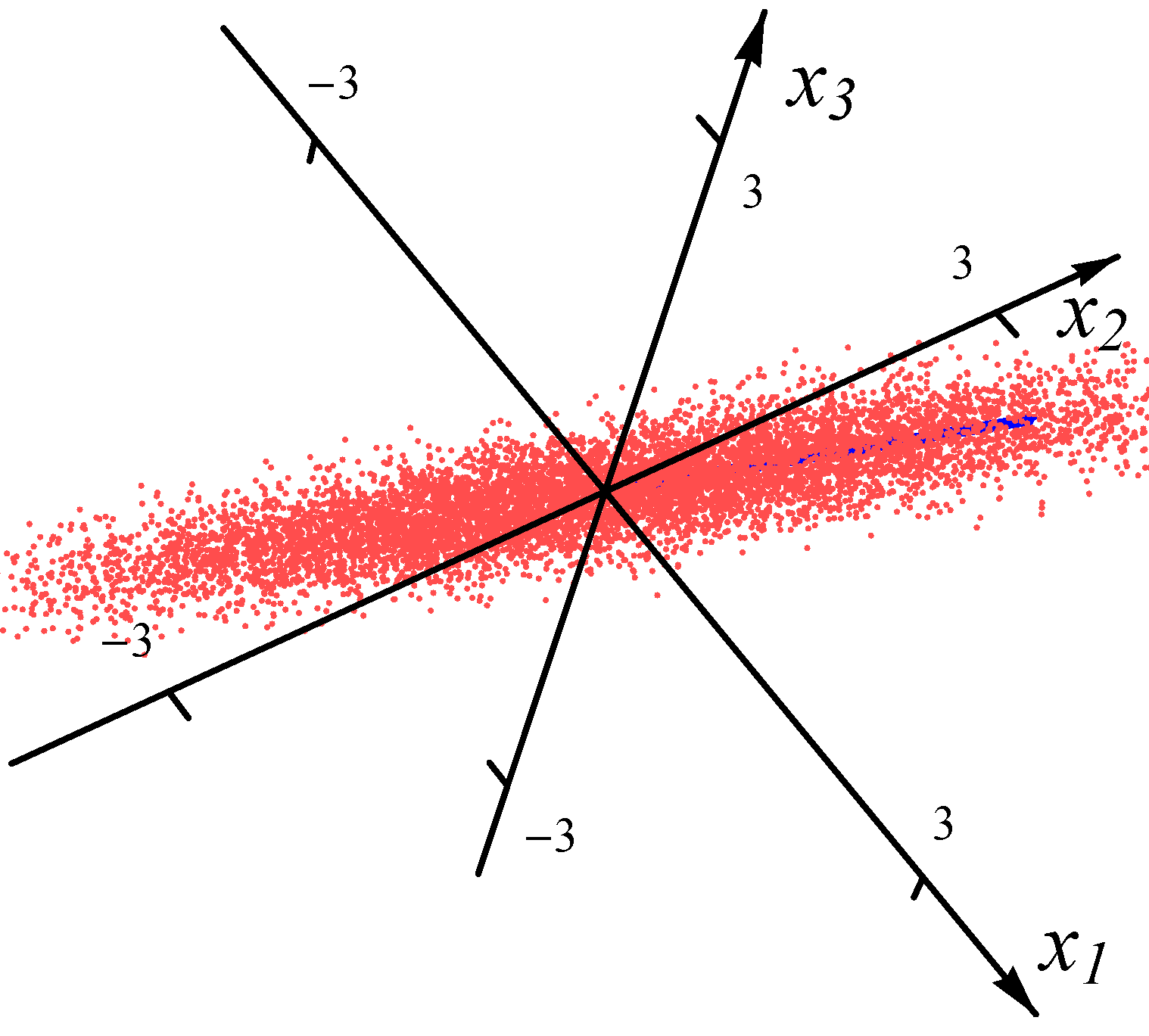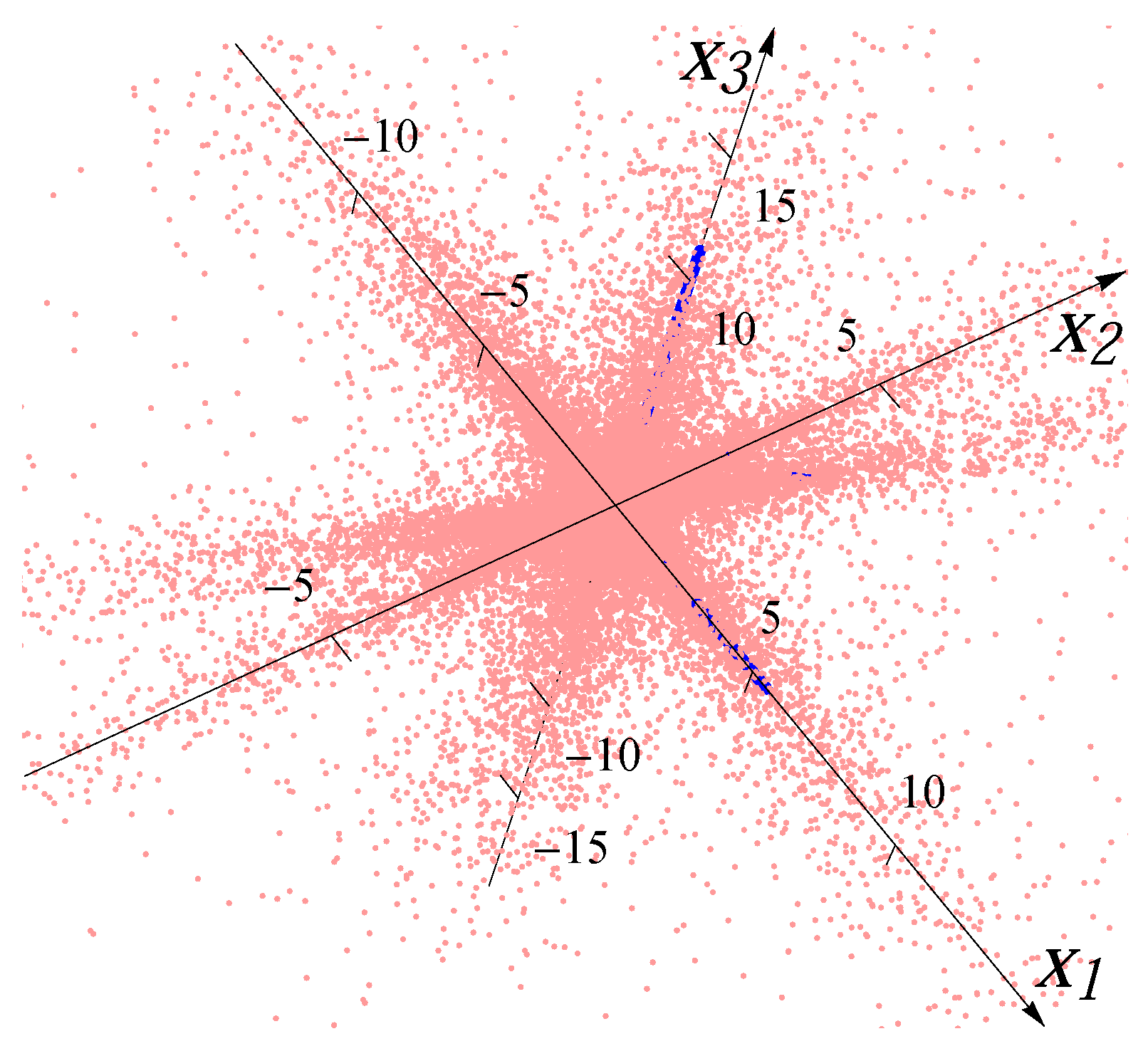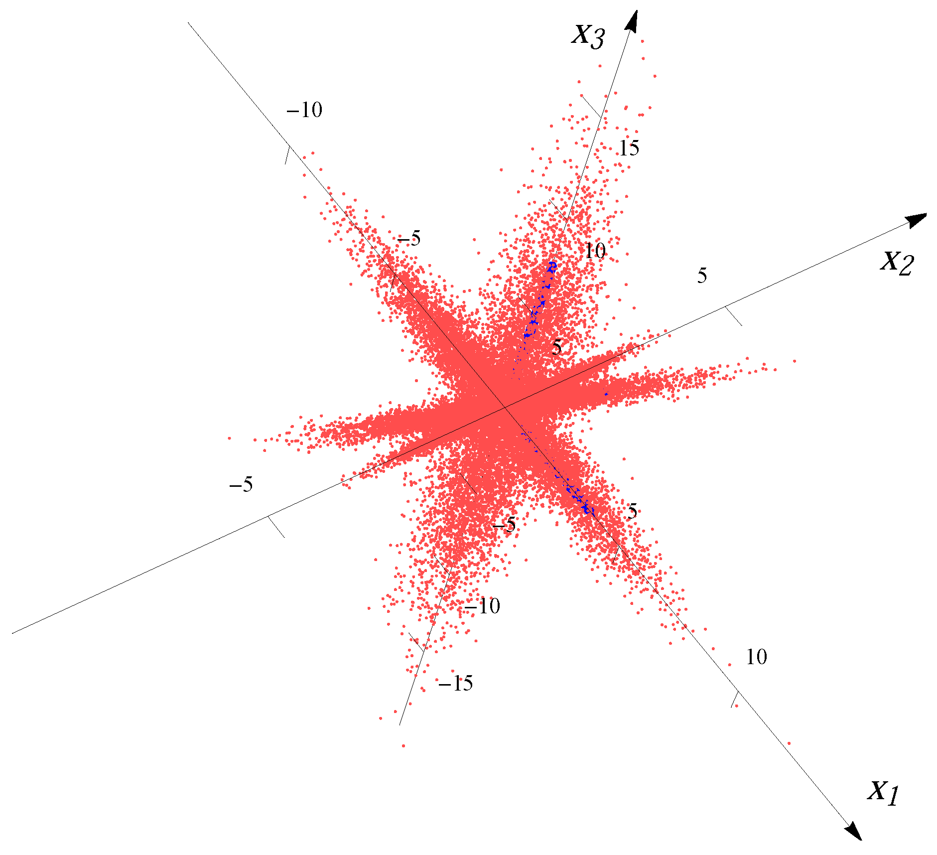 For the four-major-directions situation, we overlaid four distributions rotated to the directions , , and . The samples for each major direction are first generated with correlation/covariance matrix , and then rotated in -norm to other major directions after multiplying by a factor (to make the lengths of the “spokes” different from each other). For example, for the 3D four-major-directions distribution created by overlaying four Gaussians, the median radii of the four major directions are 2.643, 3.964, 1.586 and 7.928. Figure 3 and Figure 4 show the examples of the datasets with 32,000 data points (red dots) for four superimposed Gaussian distributions and four Student t distributions, respectively. The blue bars indicate the major directions and the magnitudes of median radii in the major directions.