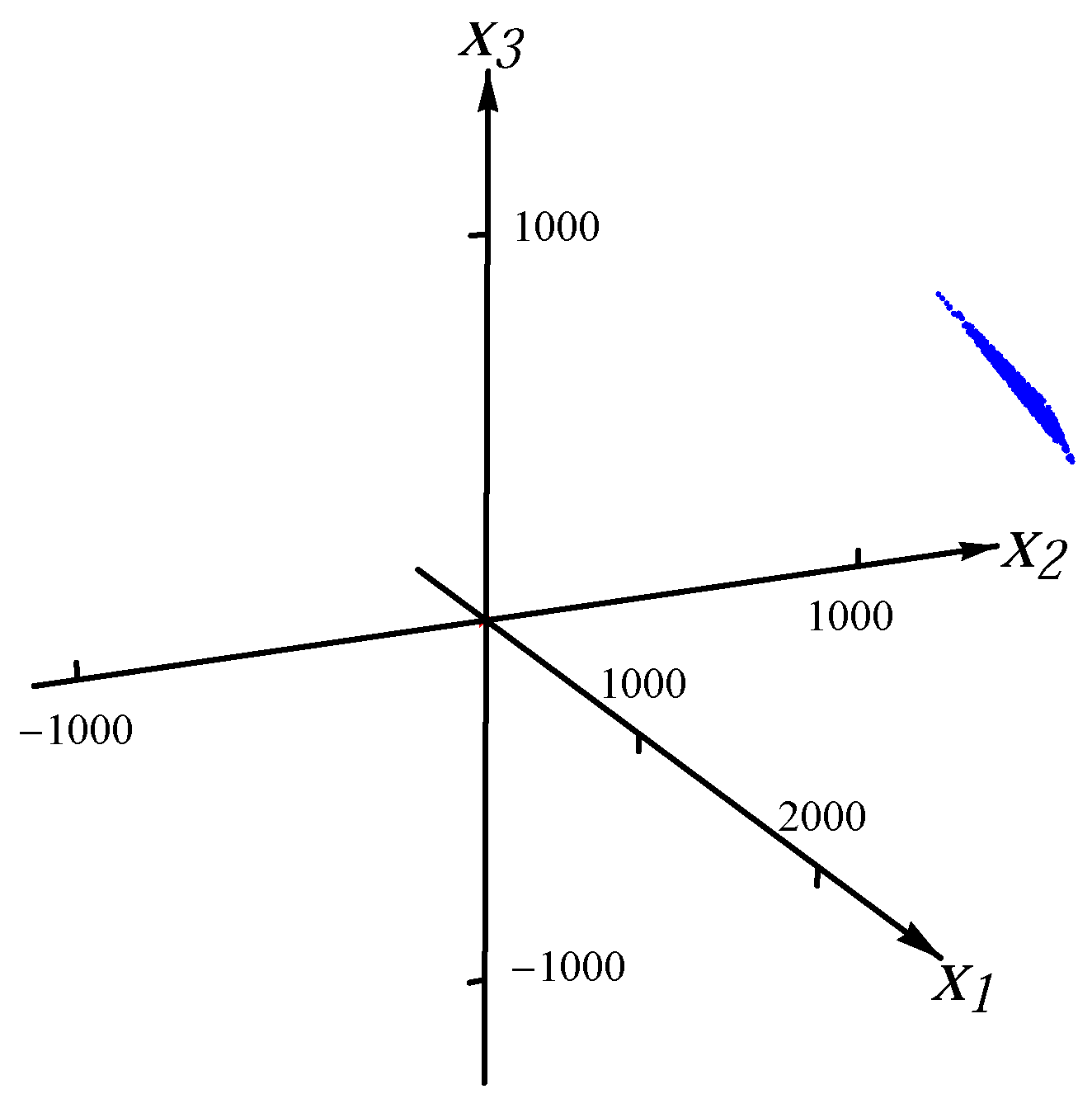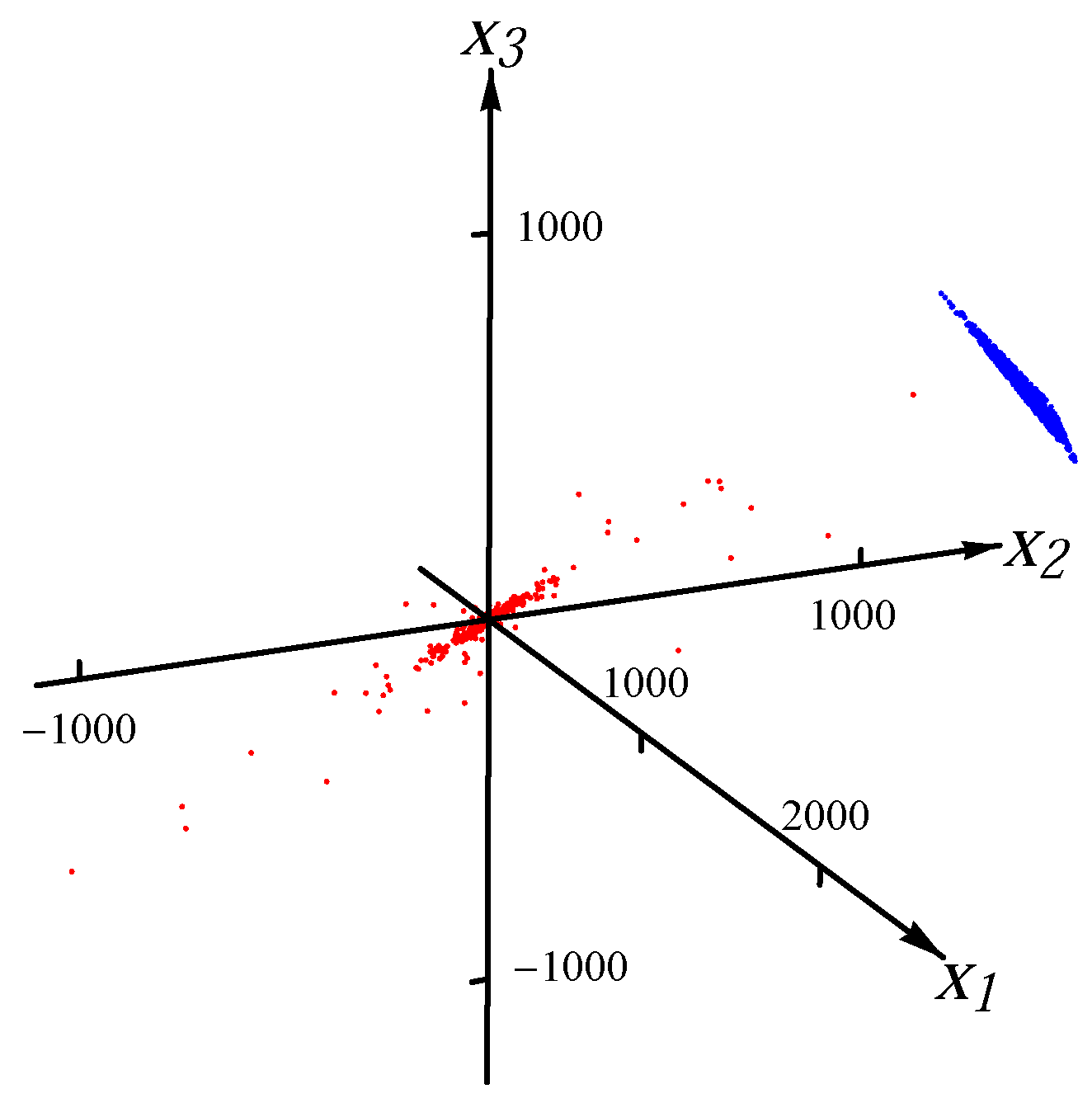 For the one-major-direction situation, the ratio of the length of the longest major direction to that of other major directions (which are equal for the covariance/correlation matrix ) is set to be a constant C for all n. To accomplish this, we set the ratio of the maximum eigenvalue () to the minimal eigenvalue () to be , i.e., . Hence, in the covariance/correlation matrix . In our experiment, we chose , which requires that . Therefore, for the one-major-direction situation, the major direction is and the ratio of the length of the longest major direction to that of other major directions is 10. In Figure 1 and Figure 2, we present the examples of the datasets with 8000 data points (red dots) for one Gaussian distribution and one Student t distribution, respectively. In order to exhibit the major component clearly, the plot range in Figure 2 is the same as the one in Figure 1. There are many points outside the plot range of Figure 2. The directions and magnitudes of median radii in the major directions are indicated by blue bars emanating from the origin.