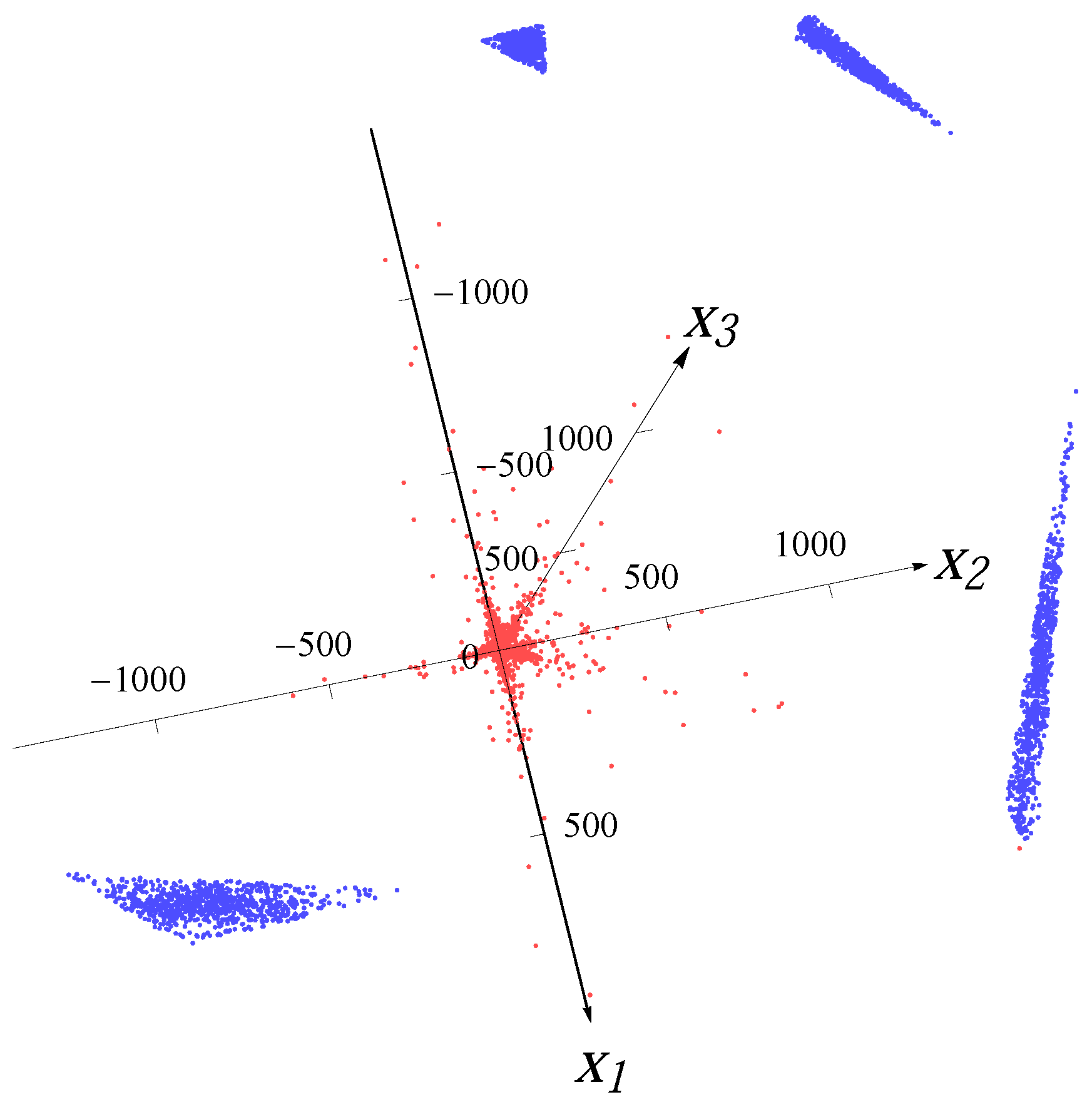 The artificial outliers are generated from a uniform distribution on a simplex. The n vertices of the simplex are randomly chosen from the intersection of the ball with the hyperplane . For each distribution in the data, the angle between the normal of the hyperplane and the major direction of the distribution is 45. In Figure 5, Figure 6, Figure 7 and Figure 8, we present examples with 10% artificial outliers (depicted by blue dots) for one Gaussian distribution, one Student t distribution, four superimposed Gaussian distributions and four superimposed Student t distributions (points from distributions depicted by red dots), respectively.