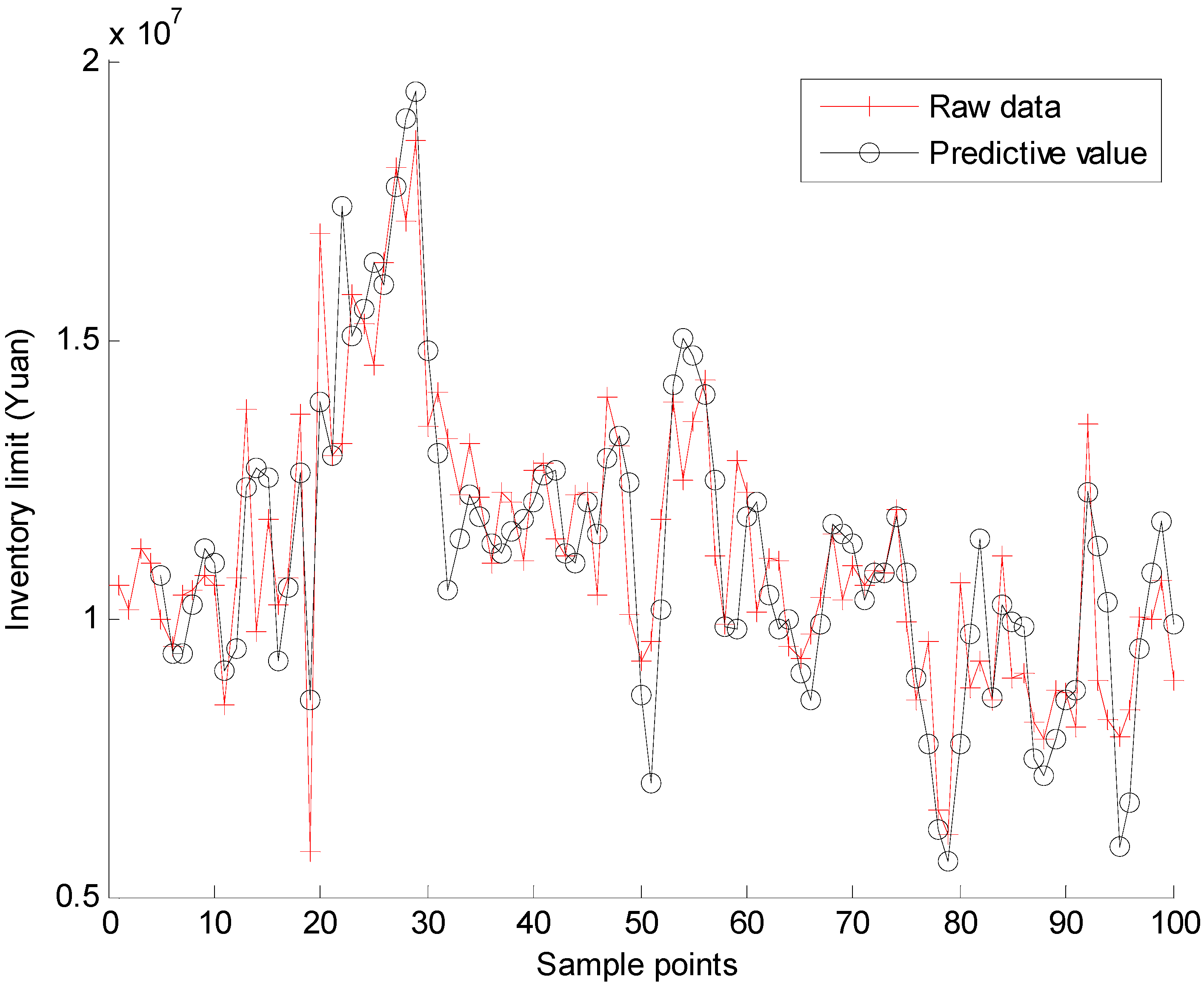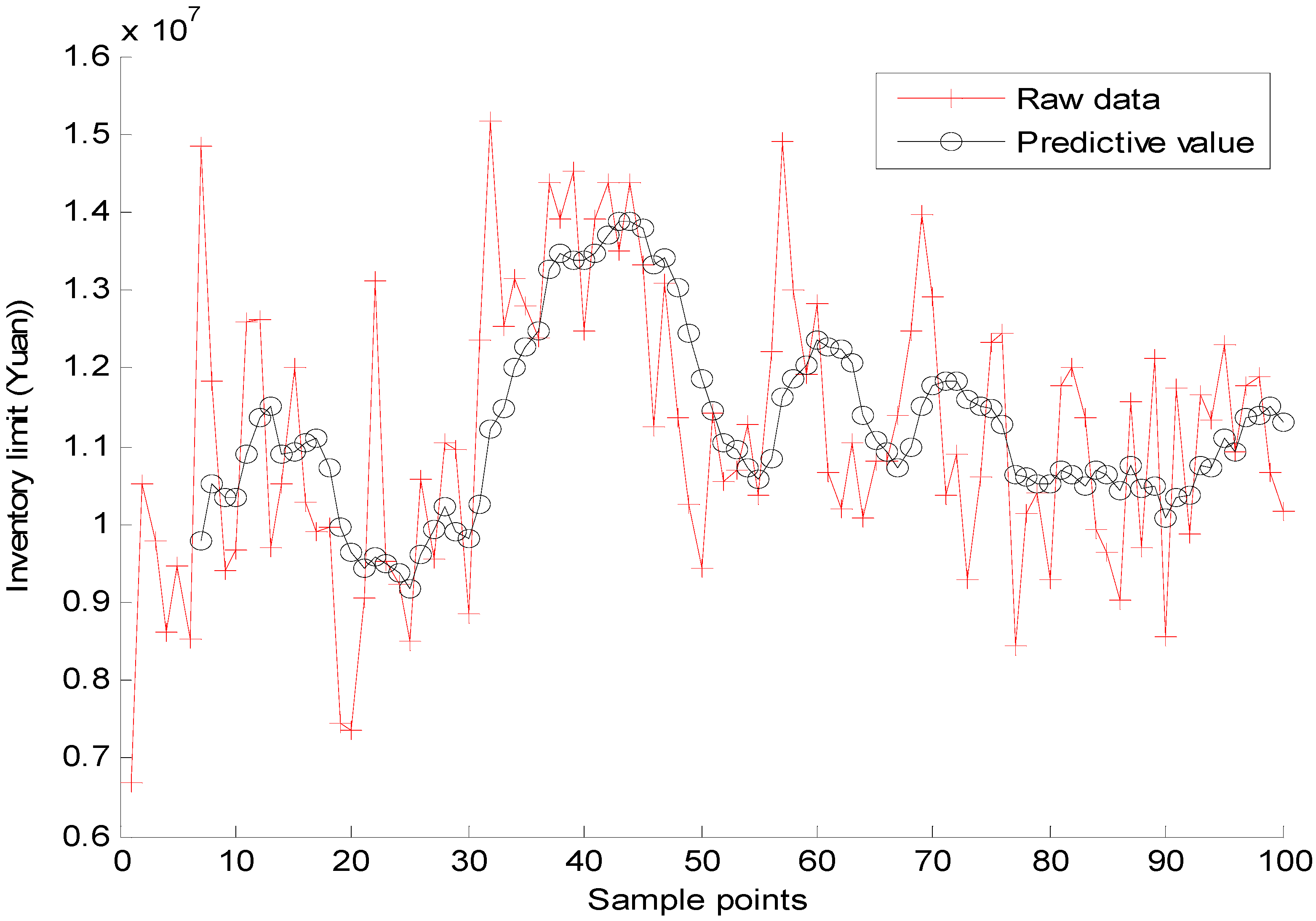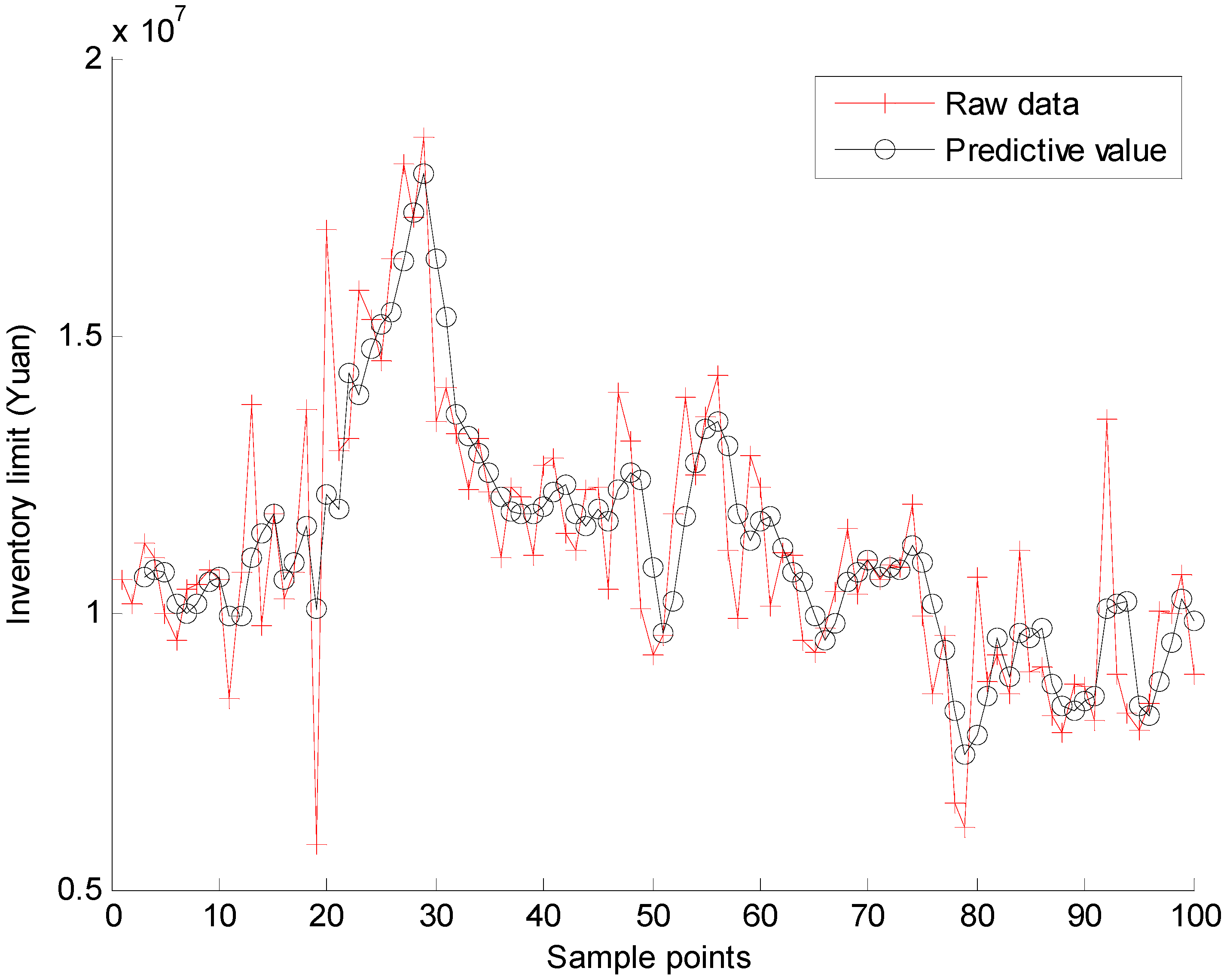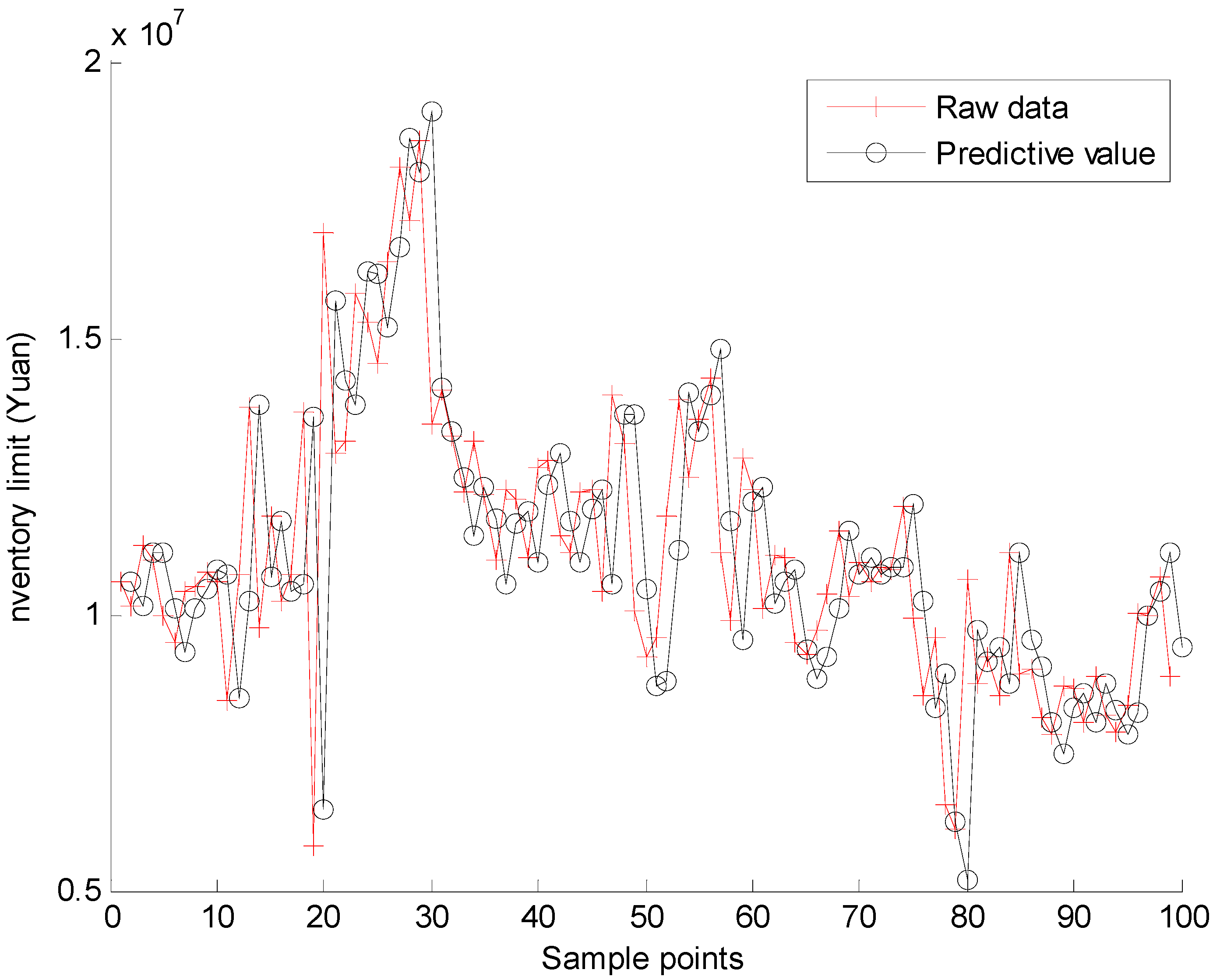 Based on the collected data in a commercial bank from January to April in 2011and 2012, the first moving average method is adopted to realize the time series prediction of bank cash flow. The cycle number of the moving average in 2011 is 2–15 and the continuous sample points are 100. The optimal moving average value for the selected data is N = 6 and the simulation results are shown in Figure 2. The cycle number of the moving average in 2012 is 2–15 and the continuous sample points are 100. The optimal moving average value for the selected data is N = 2 and the simulation results are shown in Figure 3.
