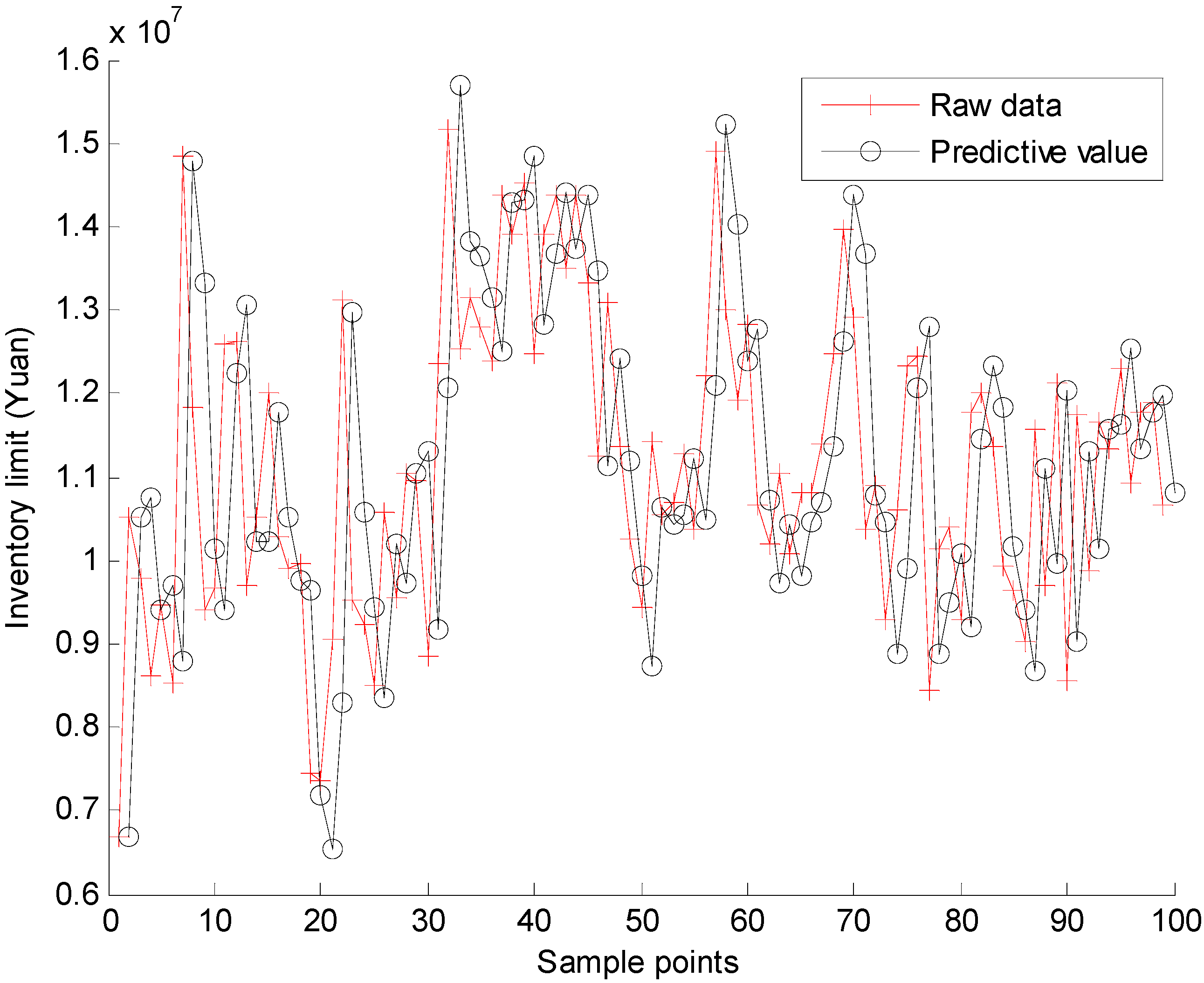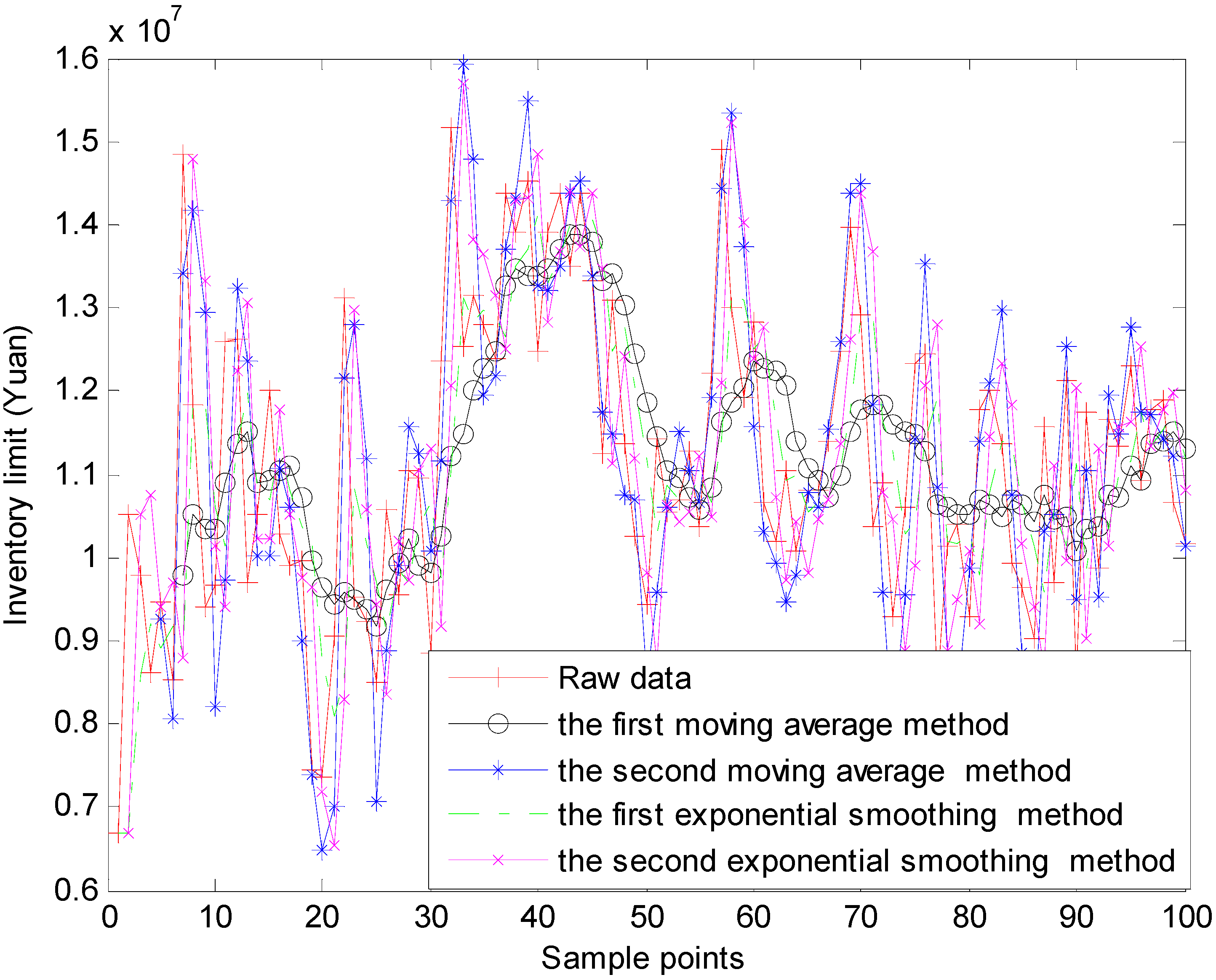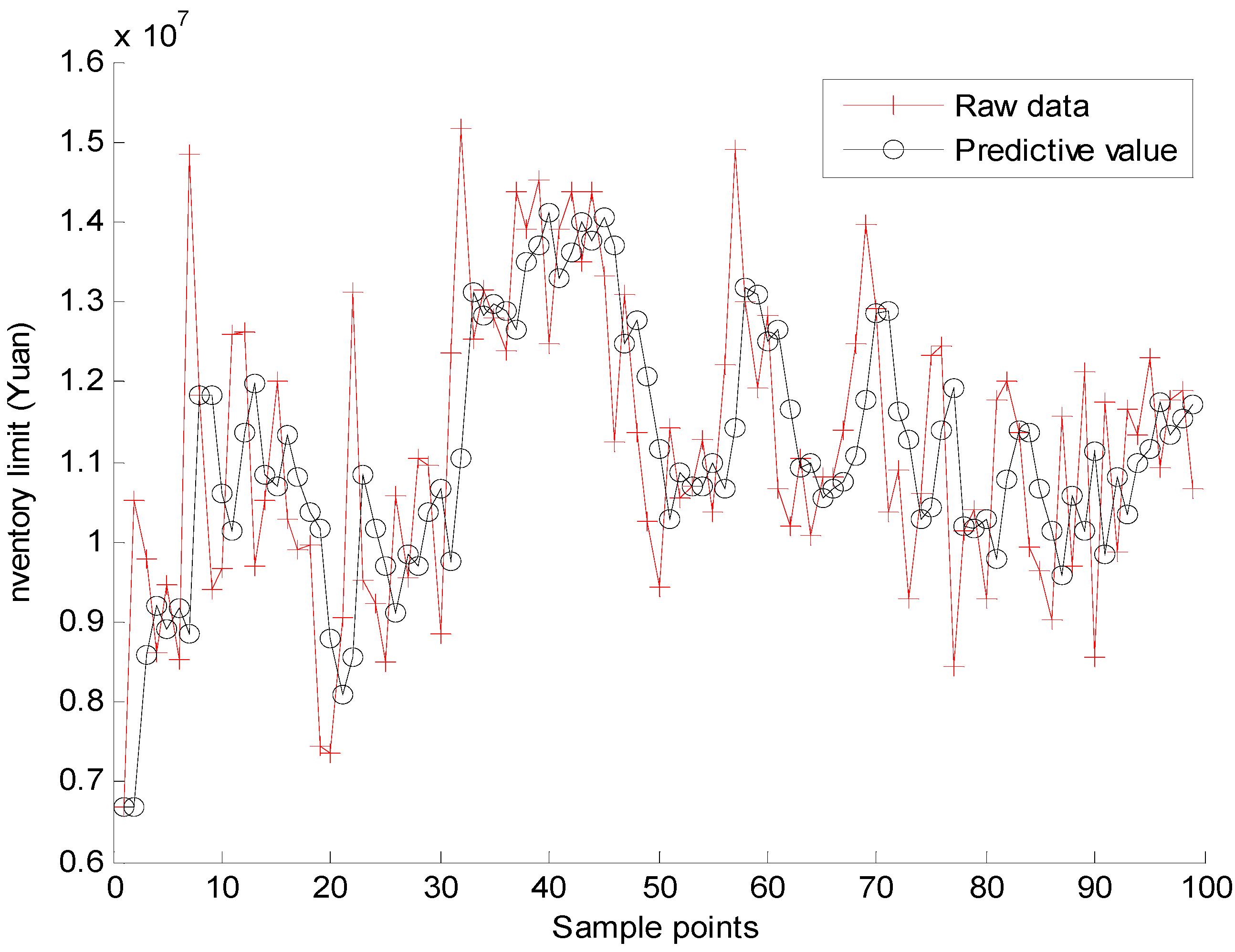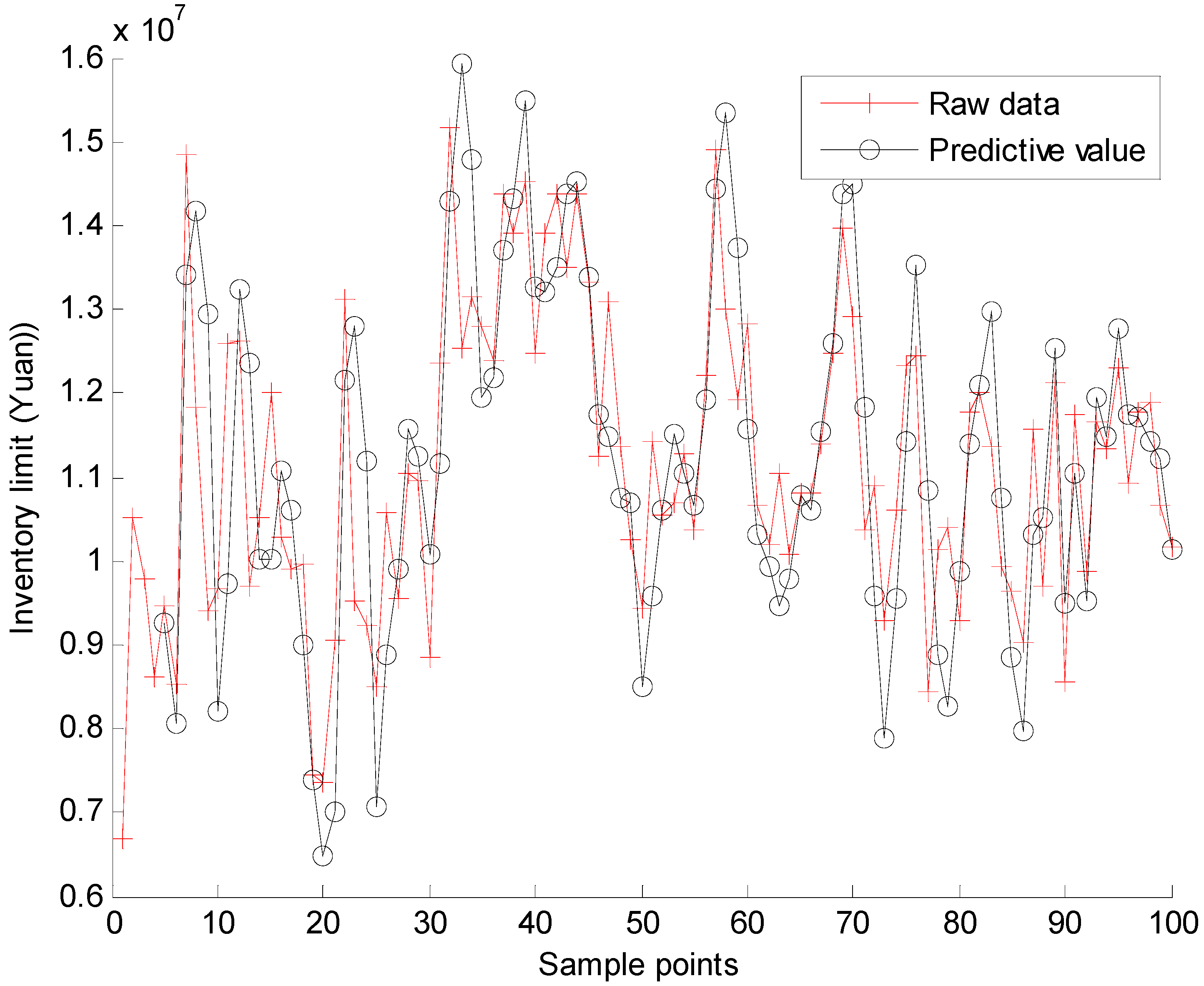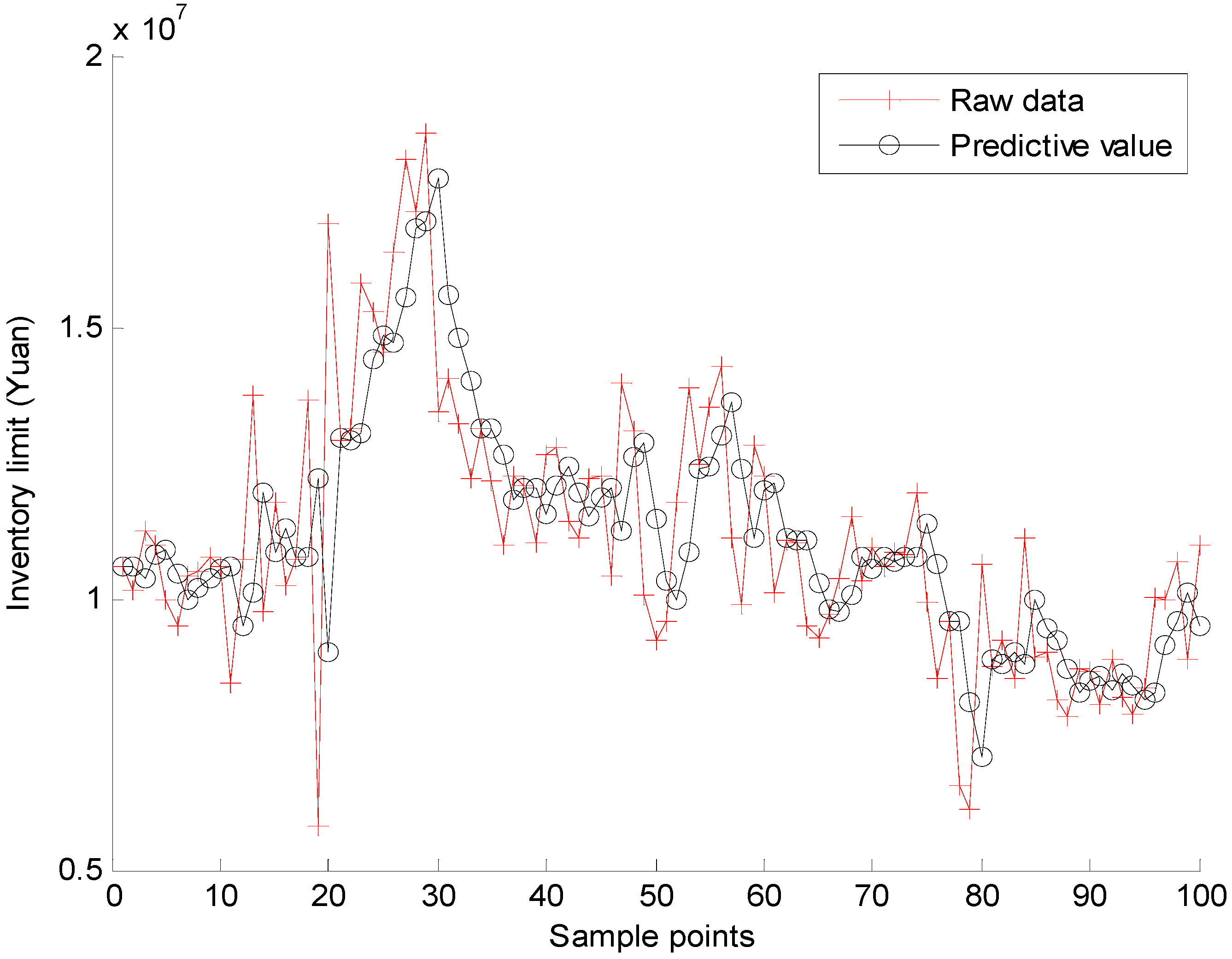 Based on the collected data in a commercial bank from January to April in 2011and 2012, the first moving average method is adopted to realize the time series prediction of bank cash flow. The cycle number of the moving average in 2011 is 2–15 and the continuous sample points are 100. The optimal moving average value for the selected data is N = 6 and the simulation results are shown in Figure 2. The cycle number of the moving average in 2012 is 2–15 and the continuous sample points are 100. The optimal moving average value for the selected data is N = 2 and the simulation results are shown in Figure 3.
