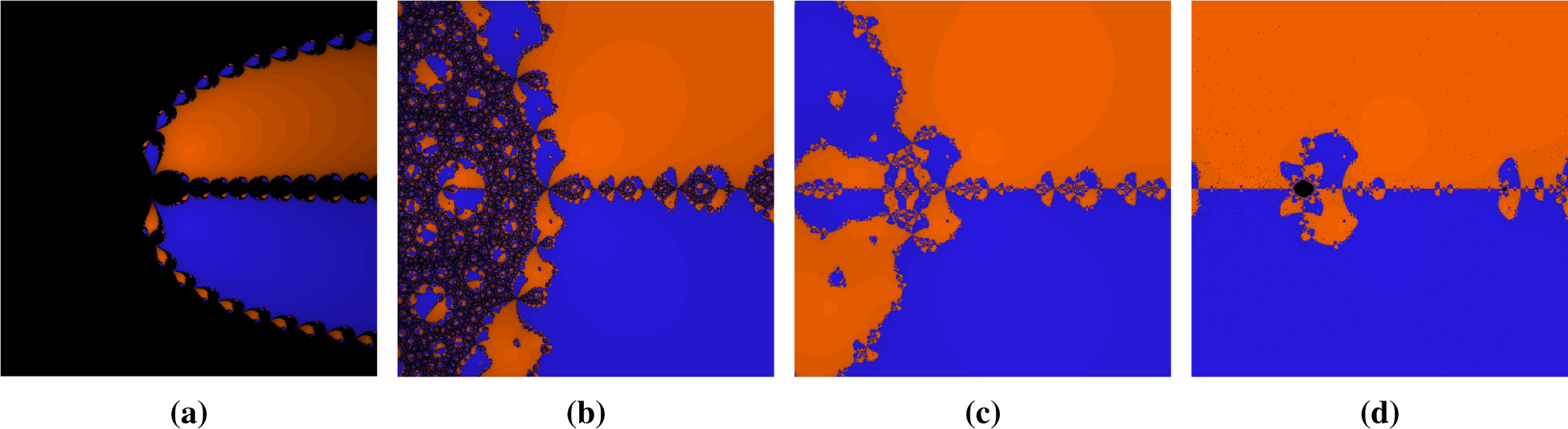 Dynamical planes of Newton’s scheme on pc(z) = z2 + c, and qc(z) = z3 + c, where c ∈ {1; i}. (a) Np1(z); (b) Npi(z); (c) Nq1(z); (d) Nqi(z).