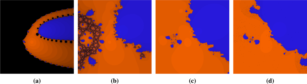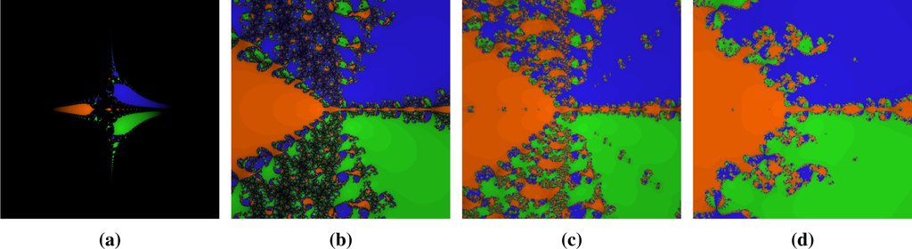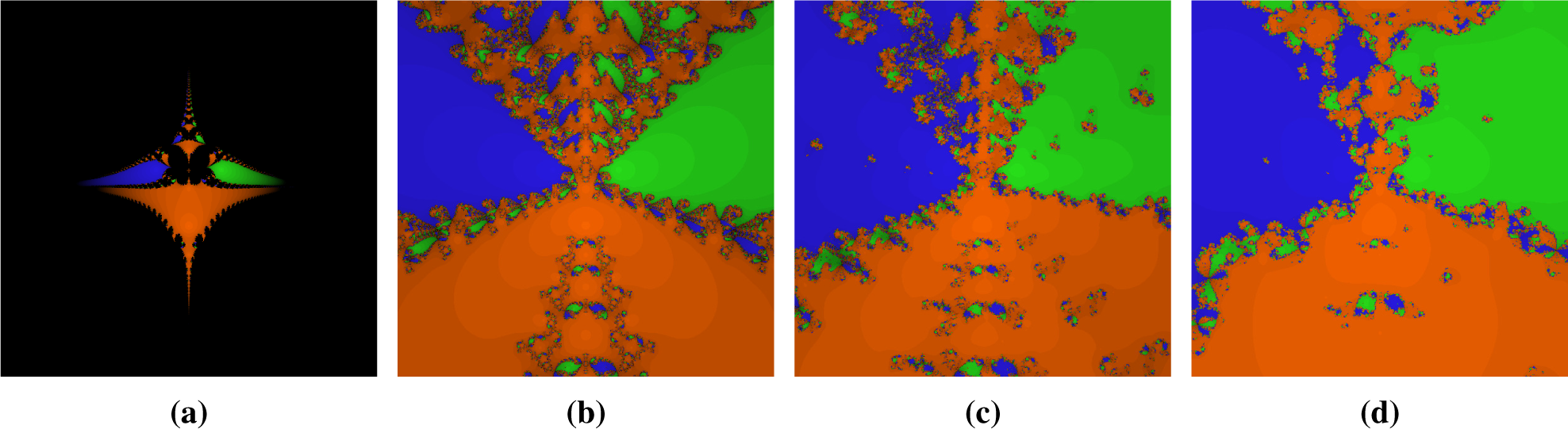 Graphically, we observe that the dynamical plane of the different methods on an specific polynomial “tends” to the corresponding dynamical plane of Newton’s one. We can see, for example, in Figure 4, how the different pictures are looking increasingly to Figure 5d. Also, the Julia sets have less complexity as the order of convergence increases. In a numerical sense, taking into account the fractal dimension of each method, it gets close and closer from Newton’s one.