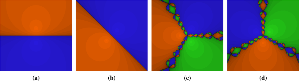 The dynamical planes of the fixed point operator associated to Newton’s method, Nf(z), when it is applied to pc(z) = z2 + c and qc(z) = z3 + c, with c ∈ {1, i}, are shown in Figure 5.