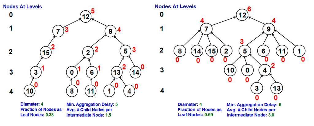 Figure 1 illustrates examples to compute the minimum aggregation delay of two different data gathering trees that have the same diameter. In both the examples, the number inside the circle indicates the node ID and the number outside the circle indicates the minimum aggregation delay for the node. DG trees that have a larger fraction of leaf nodes (and hence fewer intermediate nodes) are more likely to have a larger number of child nodes per intermediate node. For such DG trees, it would take relatively more time slots for an intermediate node to sequentially aggregate data from its child nodes (especially for intermediate nodes at higher levels), resulting in a larger aggregation delay at the leader node. Hence, even if two DG trees have the same diameter (as shown in Figure 1), it could take a relatively longer time to aggregate data from the DG tree that has a larger number of child nodes per intermediate node. This is the trend of performance that is also observed with the DG trees in the simulations, especially for networks of high–very high node density.
