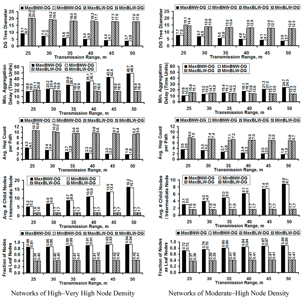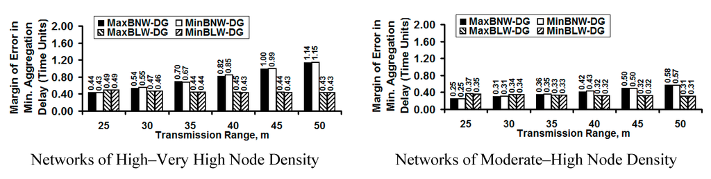 As the magnitude of the average value for the minimum aggregation delay increases, we observe the margin of error to also increase, especially in the case of the bottleneck node-weight based DG trees. For networks of high to very high density, we observe the margin of error values for the minimum aggregation delay to be relatively low for the bottleneck link weight-based DG trees, partly attributed to the lower values for the average minimum aggregation delay. Only for networks of moderate density, the margin of error values for the bottleneck node-weight base DG trees are slightly lower than that of the bottleneck link-weight based DG trees. We also observe negligible difference in the margin of error values incurred for the MaxBNW-DG trees and MinBNW-DG trees; likewise, there is negligible difference in the margin of error values incurred for the MaxBLW-DG and MinBLW-DG trees. This further vindicates our reason to just base our discussion of the results as bottleneck node-weight based DG trees vs. bottleneck link-weight based DG trees.