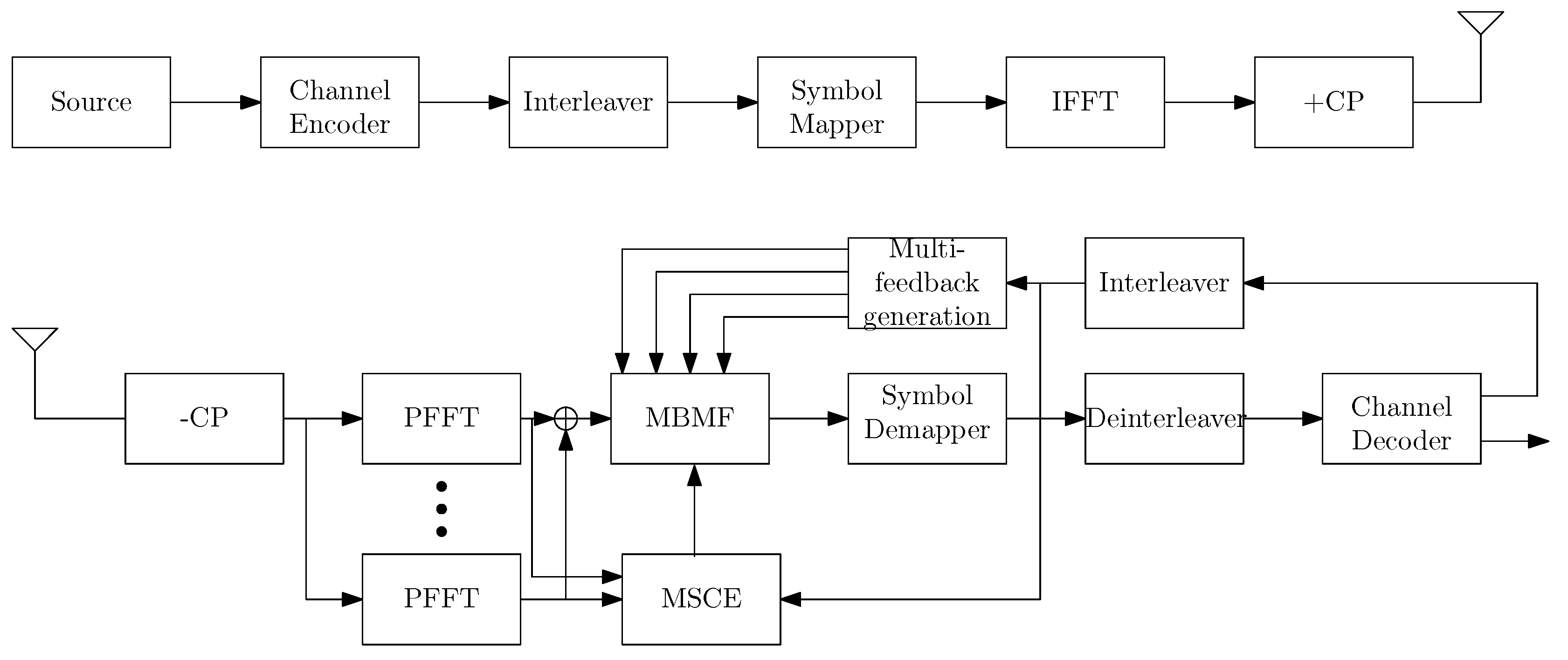 The matrix denotes the equivalent frequency channel matrix with the size of . The output of MBMF block is the output of the equalizer, which yields the estimated symbols . The bit LLRs corresponding to these symbols can be obtained and deinterleaved for the channel decoder using the MAP algorithm [25]. The output of the channel decoder, after the interleaver, is also used for the interference cancellation. The interference is regenerated by the multi-feedback generation block. For the conventional SIC receiver, the number of feedback candidates is reduced to one in the output of the multi-feedback generation block. In the following, the processing is based on the frequency domain, unless otherwise specified.