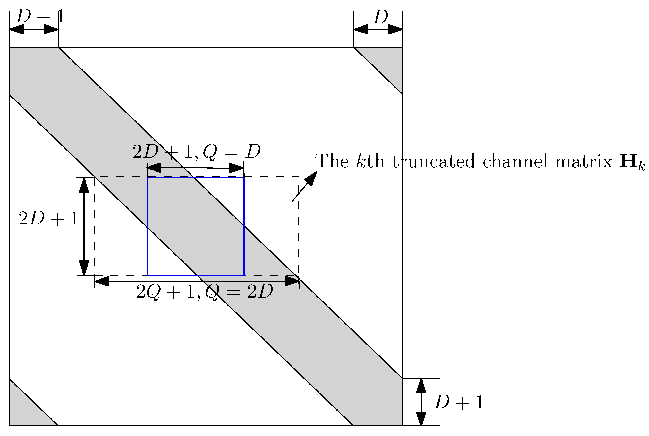 Conventionally, the more interference is mitigated, the better the SINR performance achieved. However, the output SINR of a matched filter with a reduced size channel matrix may not suffer significant performance loss compared to that with a normal-sized channel matrix. According to the statements in [19], the truncated channel matrix can also be reduced to the matrix in blue, as shown in Figure 2. The representation of the reduced channel matrix is illustrated in the blue square. It can be found that the elements in the upper-left corner and lower-right corner have been omitted compared to the matrix with