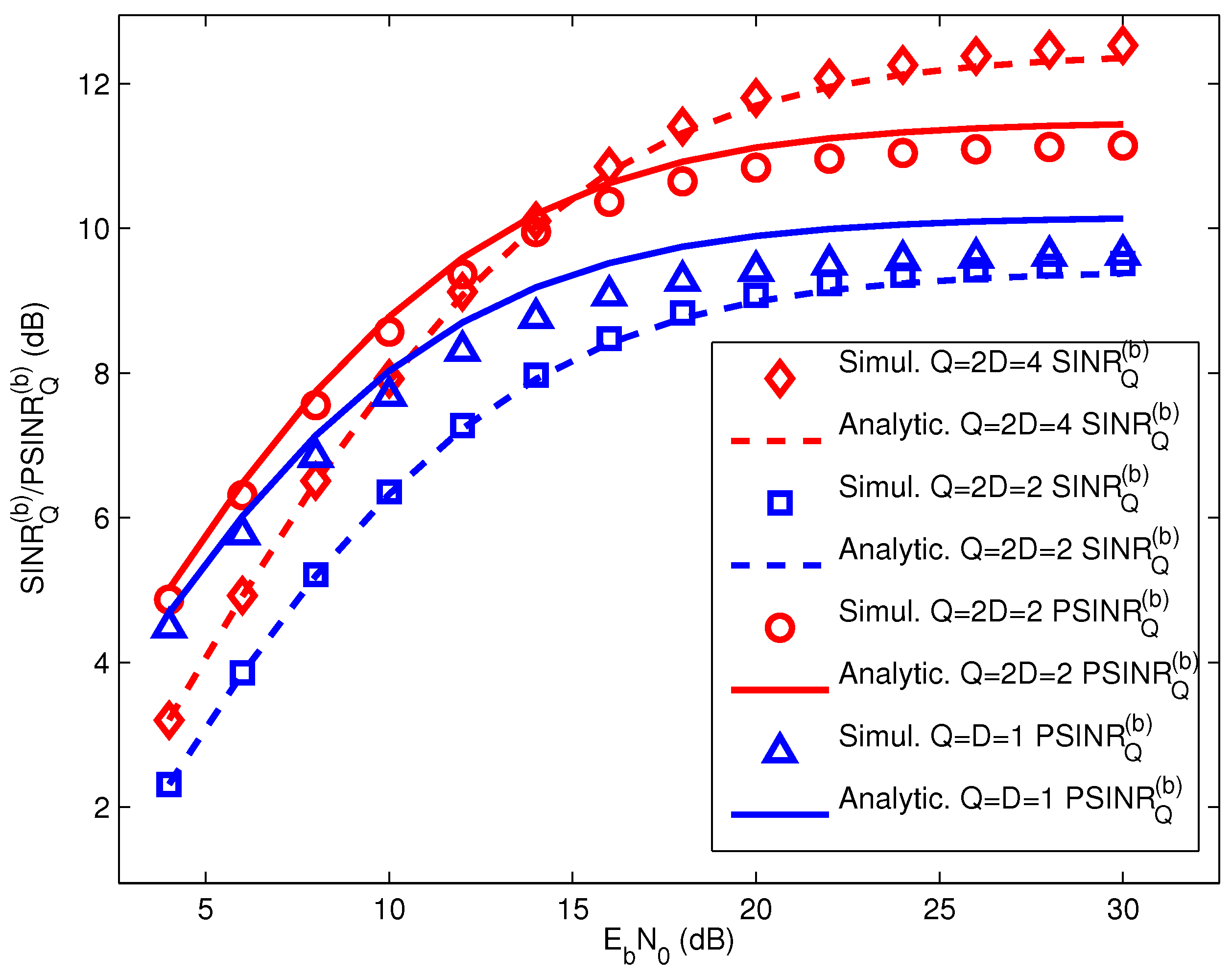 In the following, we present some simple numerical results and analytical results of pre-processing SINR () and post-processing SINR () in Figure 3, and . We can observe that the post-processing SINR (), with the same size Q, can be improved by the matched filter compared to pre-processing SINR () at low SNR values. Furthermore, the post-processing SINR performance gap between and is small (around 1 dB at 12 dB SNR). We can conjecture that the error probability of , with in Equation (10), will not be significantly degraded compared to that with . In other words, the multi-feedback cancellation with requires less complexity than that with in the cancellation stage, but achieves similar post-processing SINR performance.