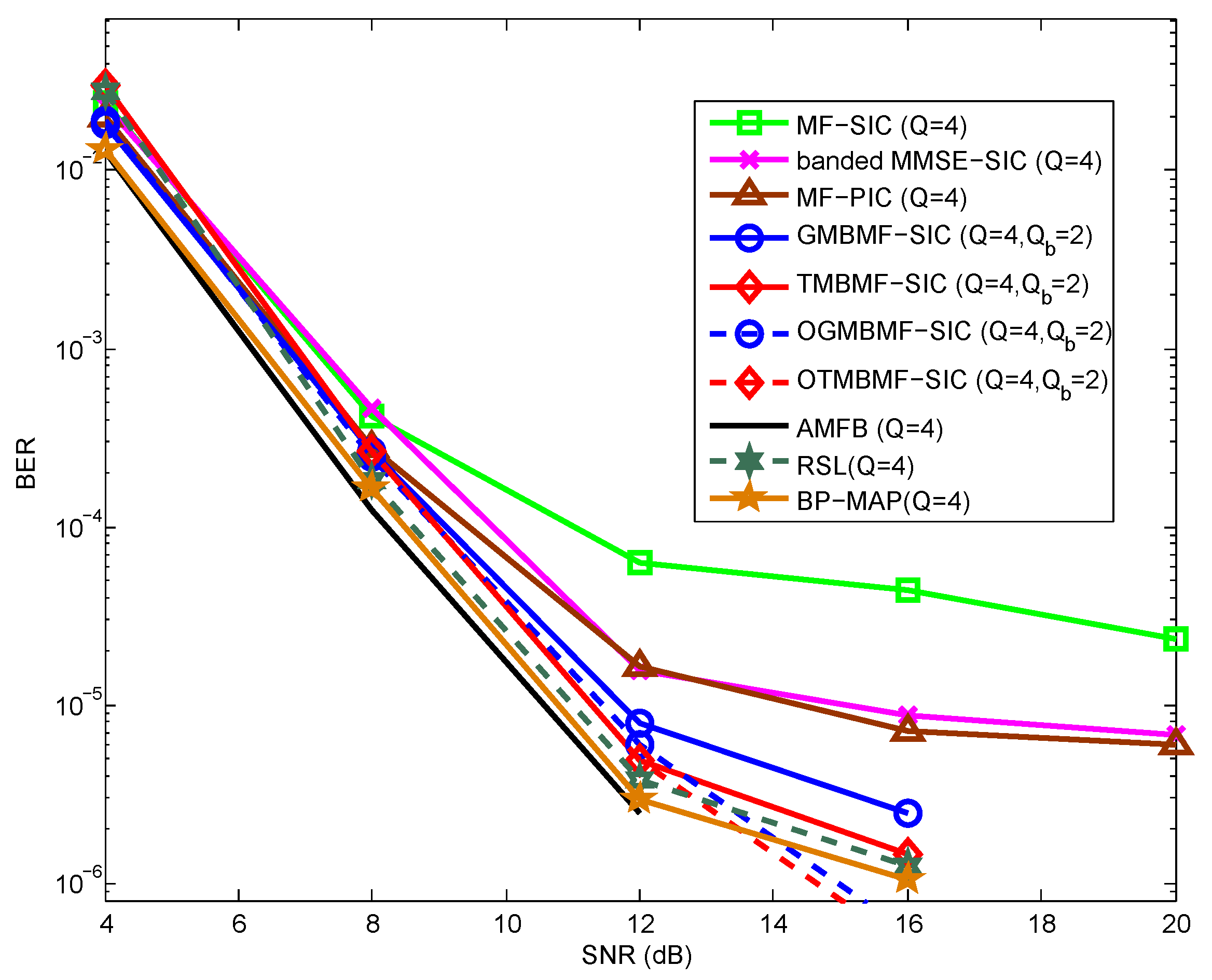BER performance against SNR (dB) of MF-PIC, GSG-based MBMF-SIC, ordering GSG-based MBMF (OGMBMF)-SIC, TSG-based MBMF (TMBMF)-SIC, ordering TMBMF (OTMBMF)-SIC, MF-SIC, banded MMSE-SIC and approximate matched filter bound (AMFB) in the fourth iteration with .