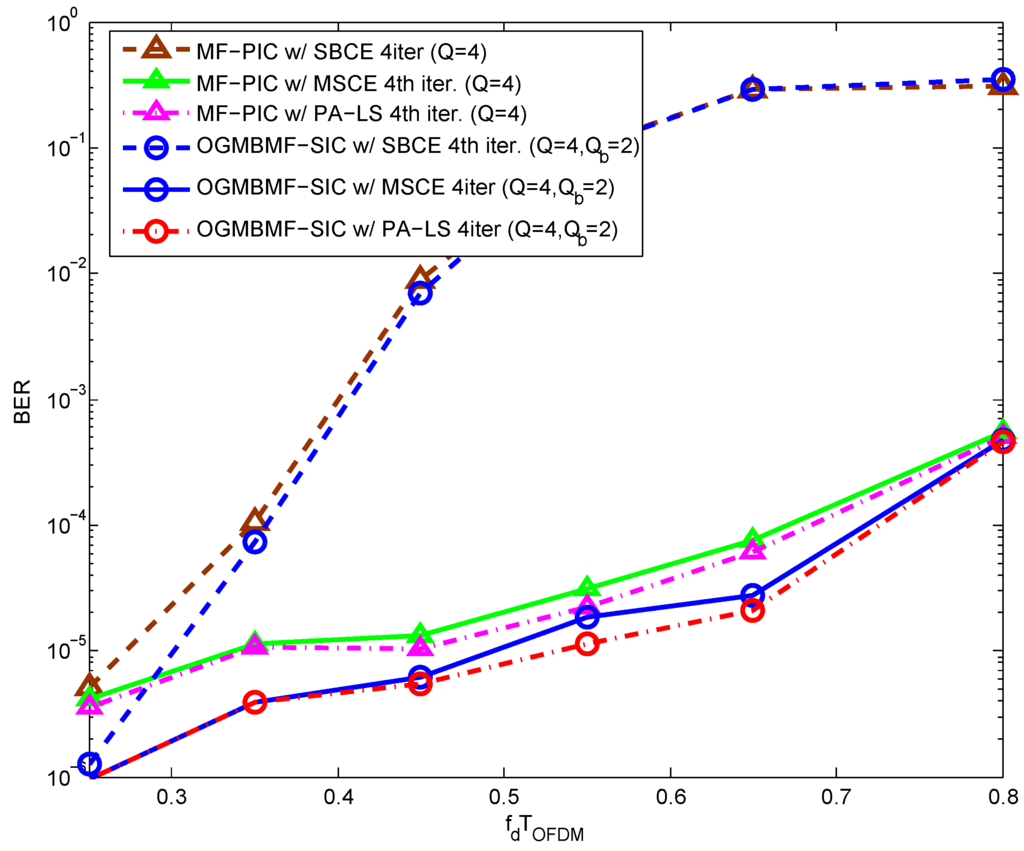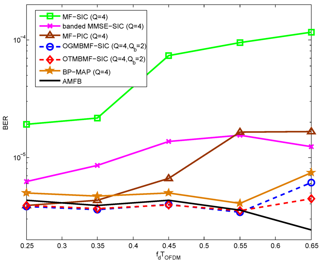 The BER performance of the fourth iteration against normalized Doppler frequencies from to has been illustrated in Figure 6, which validates the statements that the proposed OGMBMF-SIC and OTMBMF-SIC can work in a wide range of high Doppler frequencies . We can observe that the power of ICI inside the band is reduced at high Doppler frequencies. Additionally, the MF-SIC and MF-PIC can only be used at low Doppler frequencies.