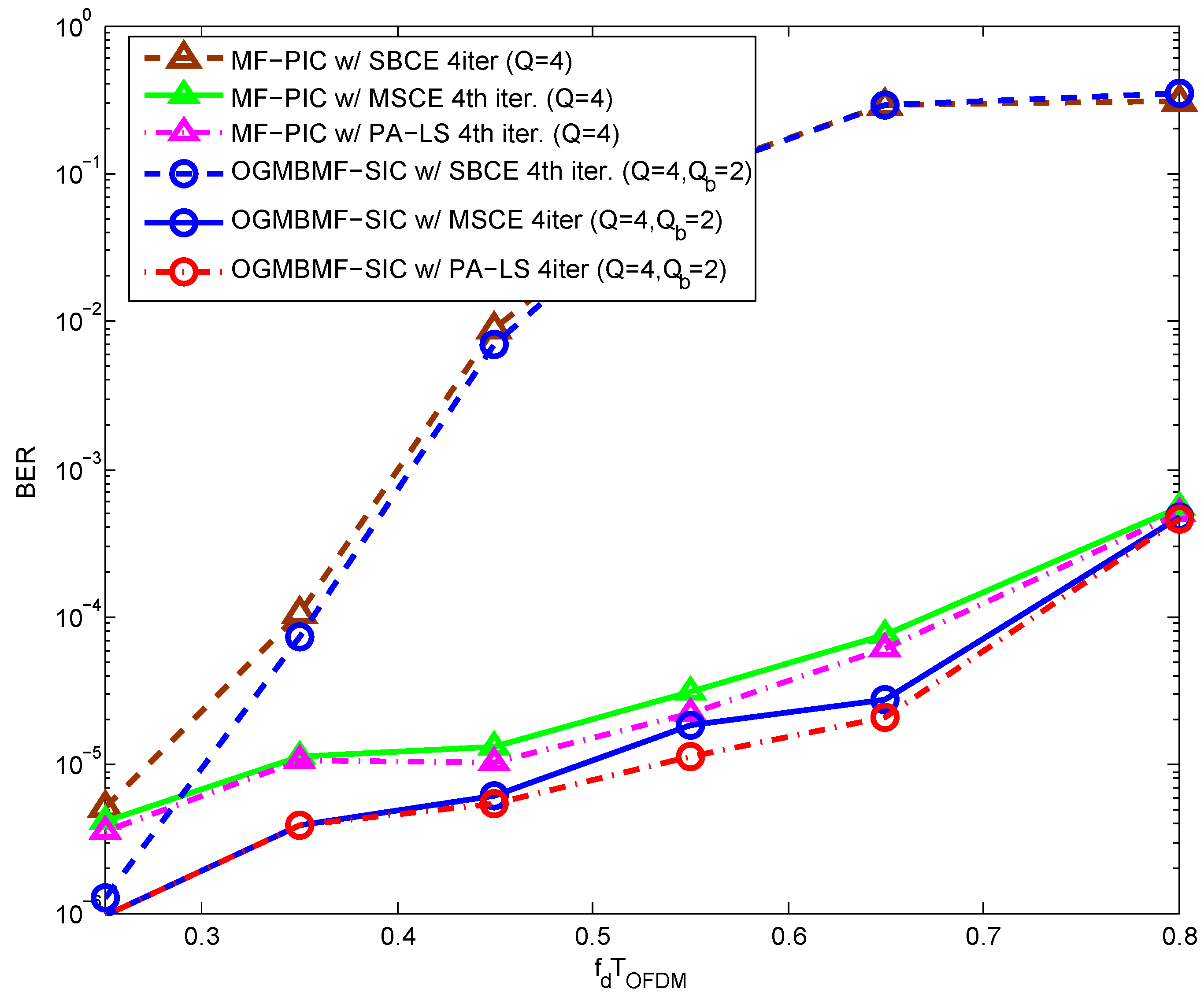 To show the robustness to the high normalized Doppler frequencies, we compared the SBCE, PA-LS and MSCE in terms of BER performance in the fourth iteration. In Figure 8, the MF-PIC and OGMBMF-SIC with SBCE cannot work at normalized Doppler frequencies over . Additionally, the curves for MSCE are almost identical to those for PA-LS, only slightly poorer at high normalized Doppler frequencies, which implies that the MSCE performed in an iterative manner and with the aid of data symbols can approach the performance of PA-LS, which uses the discrete Karhunen-Loève (DKL)-basis expansion model (BEM) to approximate the channels with five expansion coefficients.