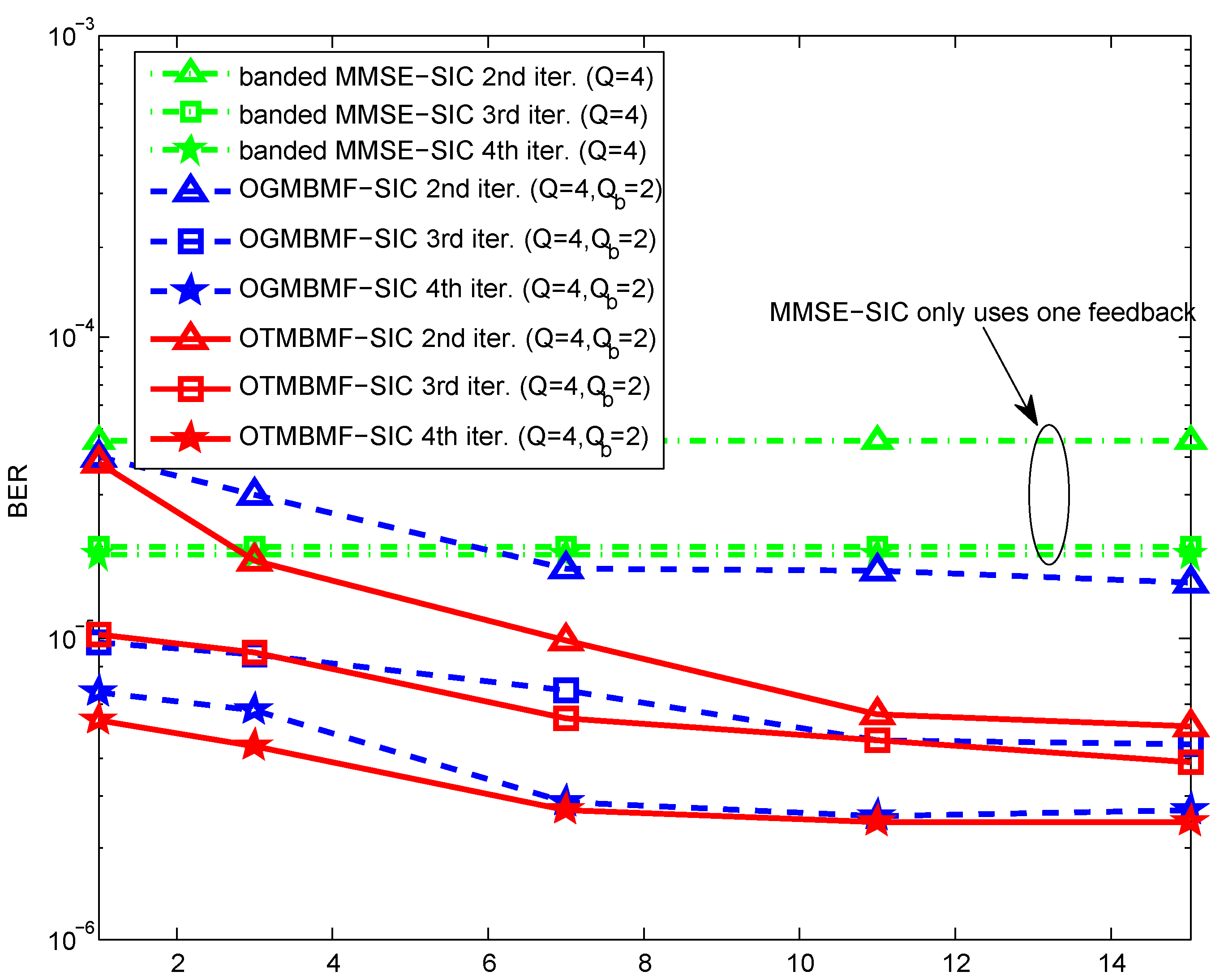 Figure Figure 7 compares the BER performance against SNR (dB) with a normalized Doppler frequency in the fourth iteration. The MSCE is iteratively performed in every iteration, once the new symbol estimates become available from the channel decoder. The BER performance of these receivers in the first iteration is very poor, with , which may not be useful for comparison. Matched filter-based receivers (MF-SIC, OGMBMF-SIC) are less sensitive to channel estimation errors, because they do not make use of channel coefficients as much as banded MMSE-SIC. For banded MMSE-SIC, the autocorrelation matrix must be used, which may amplify the channel estimation errors. In Figure 5, the banded MMSE-SIC outperforms MF-SIC with perfect channel knowledge in the BER performance. However, their performance at SNR dB has been degraded to the same level of BER (less than 1 dB performance loss) in the fourth iteration with MSCE. MF-PIC is not very close to banded MMSE-SIC with channel estimation, because the autocorrelation matrix is also required for MF-PIC for ICI cancellation. Intuitively, the proposed OGMBMF-SIC has the same advantages as MF-SIC. With MSCE, OGMBMF-SIC can still achieve an acceptable BER performance in such a high mobility scenario (), which makes OGMBMF-SIC more practical.