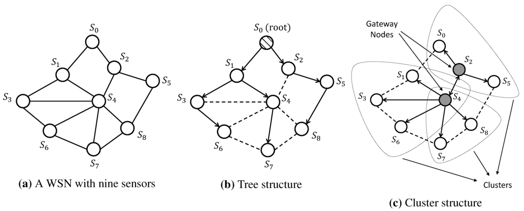 Each sensor in a WSN operates independently and has its own clock. Even if the clocks of sensors are initially tuned perfectly, due to the imperfections of the clock oscillator, they may drift away from the ideal time as time evolves []. Hence, developing efficient clock synchronization protocols is critical in WSNs. In the literature, many clock synchronization algorithms rely on the clock information from the Global Positioning System (GPS). However, GPS is not ubiquitously available and requires a high-power receiver []. This fact makes it impractical to implement GPS technology in the clock synchronization of WSNs, since WSNs generally consist of small sensors that have limited energy. Furthermore, sensors sometimes are positioned in an environment where the GPS signal is not available, as is the case with underwater or underground sensors for water quality monitoring. For clock synchronization applications in computer networks, the network time protocol (NTP) represents one of the oldest and standard Internet timing protocols in current use []. However, NTP is still not suitable for WSNs, due to the lack of energy availability and unstable working environment in WSNs. Therefore, a variety of synchronization protocols have been particularly designed for WSNs. In general, these protocols perform clock synchronization via timing message exchanges among sensors. However, due to the power requirement for each individual sensor, sensors have a limited communication range, and they are not able to communicate with every other sensor. An example of a WSN with nine sensors is shown in Figure 1a, where each circle denotes a sensor and each edge represents the communication link (if present) between the corresponding pair of sensors.