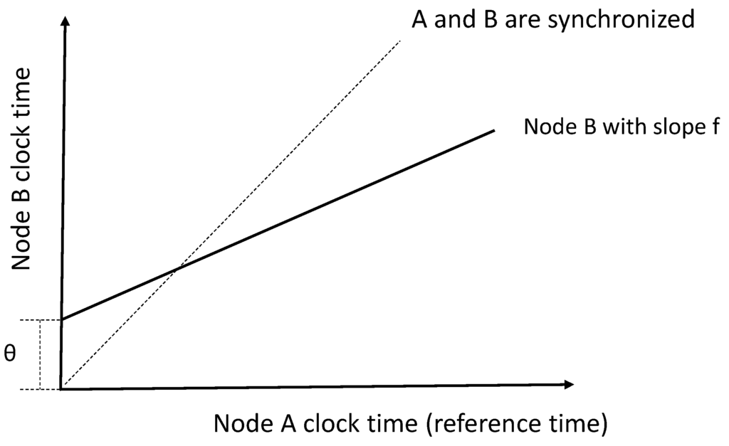 where θ and f stand for the clock offset and skew between Nodes A and B, respectively. A graphical interpretation of the relationship between the clocks of Nodes A and B is shown in Figure 2. It can be seen that if