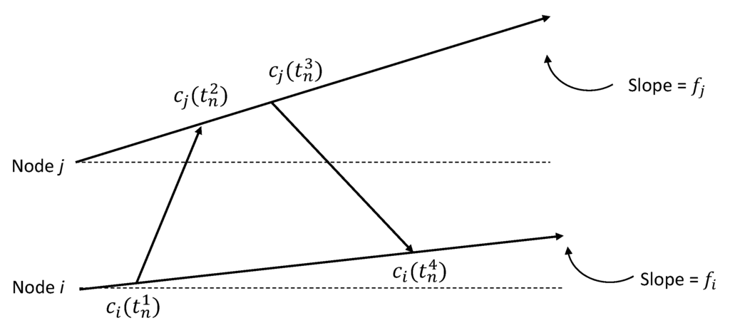 denote the clock offset (phase difference) and the clock skew (frequency difference) for sensor node i, respectively []. In this way, if the clock of Node A is selected to be the reference time, it follows that: