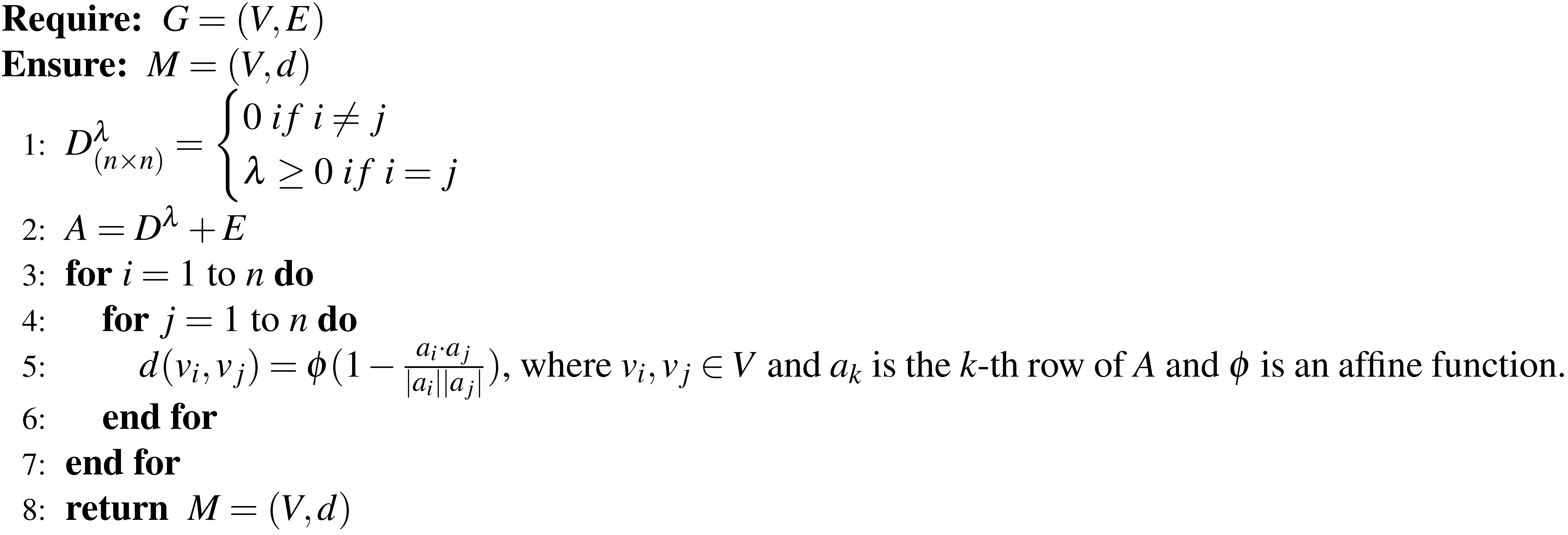 In this subsection, we demonstrate the algorithm to convert the nodes of the graph to the points of a metric space preserving the community structure of the graph. The algorithm depends on the sub-modules (1) construction of ( or ) and (2) obtaining a structure-preserving distance function. The algorithm works by picking a pair of nodes from and computing the distance defined in the second module.