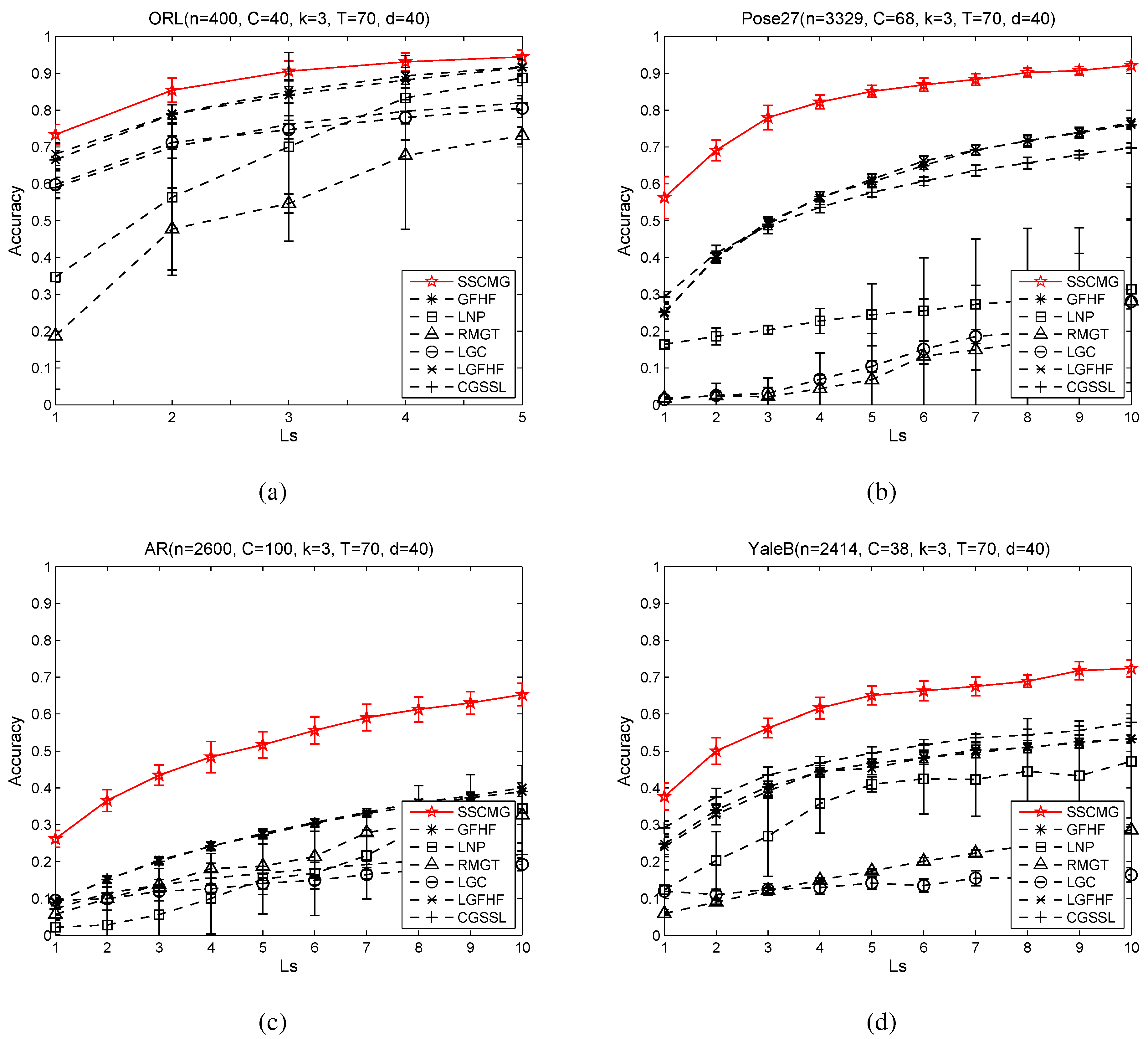 From these four sub-figures, it is easy to observe that SSCMG achieves better performance than these comparing methods on all facial datasets and GFHF almost ranks second among these comparing methods. Although SSCMG, LGFHF and GFHF are based on the same objective function, SSCMG always outperforms the latter two. That is because SSCMG utilizes a mixture graph combined by multiple kNN graphs defined in the subspaces, whereas the latter two depend on a single kNN graph constructed in the PCA reduced space. This observation not only justifies the statement that graph determines the performance of GSSC methods, but also supports our motivation to utilize mixture graph for semi-supervised classification. LGFHF is slightly superior to GFHF. This fact indicates local scaling technique can only improve the kNN graph in a small scale. LGC often loses to other methods. The reason is that LGC utilizes a fully connected graph rather than a kNN graph, and this fully connected graph is more heavily distorted by noisy features. RMGT and LNP apply different techniques to optimize a kNN graph, but their accuracies are almost always lower than that of SSCMG. The cause is that optimizing a kNN graph that distorted by noisy features is rather difficult. CGSSL uses a compact graph and it often outperforms LNP, which is based on a non-compact graph, but CGSSL is always outperformed by SSCMG. These facts suggest that optimizing an graph alone can only improve the performance in a small range, and it may not result in an optimal graph for semi-supervised classification.