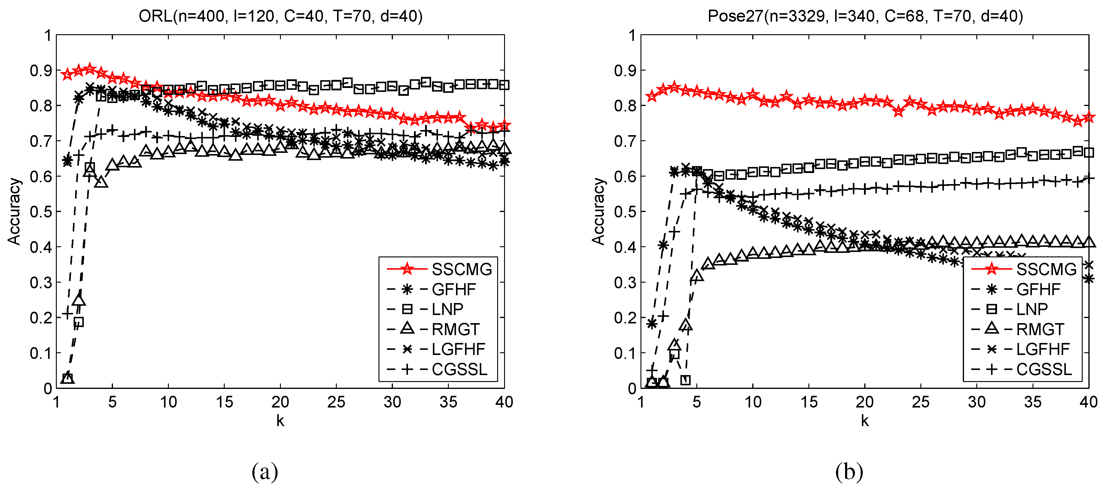 k increasing, the accuracy of GFHF and LGFHF on ORL and Pose27 downgrades much more than that of SSCMG, this observation suggests that mixture graph is less suffered from the choice of