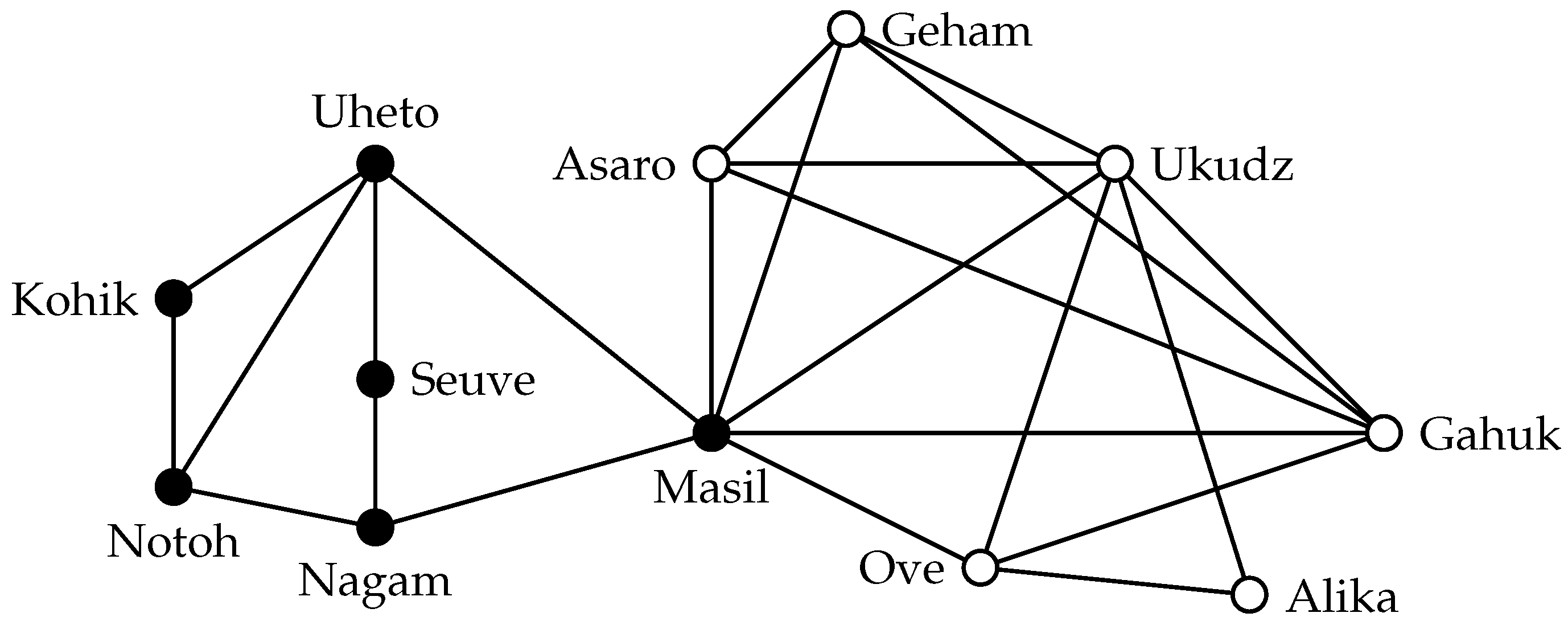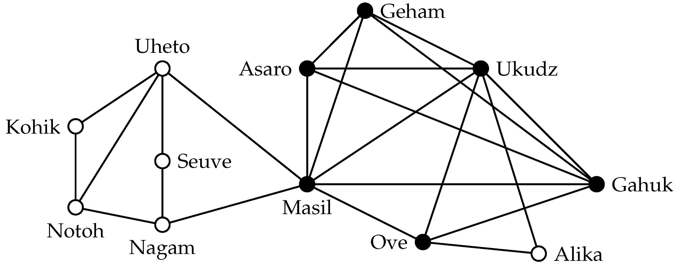 There are two reasons why this is the case. First, the data collection is usually subject to noise. In the example, this could be the case if the researcher misinterpreted the relationships between some tribes. Thus, even if cliques are the correct model for communities, the real communities will not appear as cliques in the network, because some edges are missing due to noise. The second issue, which cannot be avoided by being more careful in the data collection, is that in many scenarios, it may be allowed that not all members of a community have to interact with each other. In the example network, the “Ove” and “Geham” tribes have no friendly relationship with each other. This is not necessarily a sign of a hostile relationship, but, as a geographic overview over the areas settled by the tribes suggests [