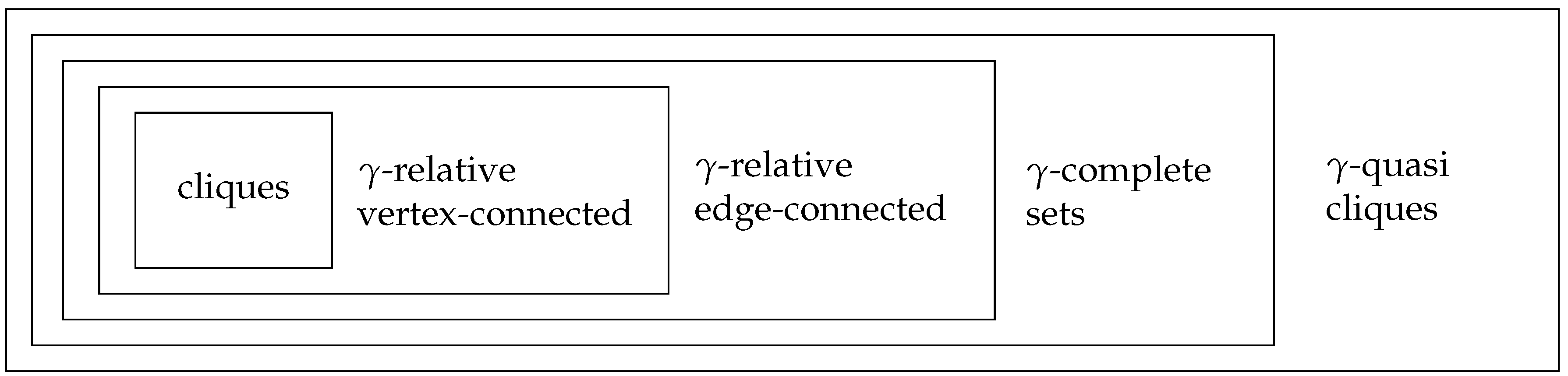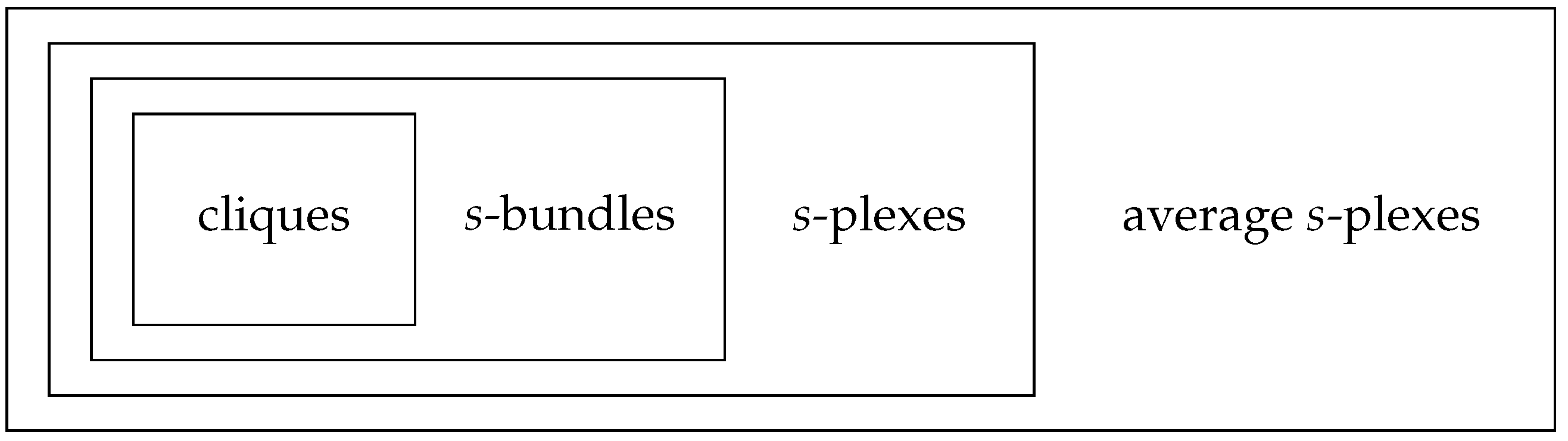 As for degree-based and density-based clique relaxations, there are relations between s-bundles and their relative counterpart, the γ-relative-vertex-connected sets. In addition, every s-bundles is also an s-plex, since is upper-bounded by the minimum degree of G. Hence, the s-bundle property is more restrictive than the s-plex property. For , the two properties coincide, that is, every 2-bundle is also a 2-plex. For , the properties are different. Consider, for example, a graph consisting of two isolated edges. This graph is a 3-plex (the minimum degree is ), but not a 3-bundle (it is not connected, but a 3-bundle on four vertices needs to be connected).