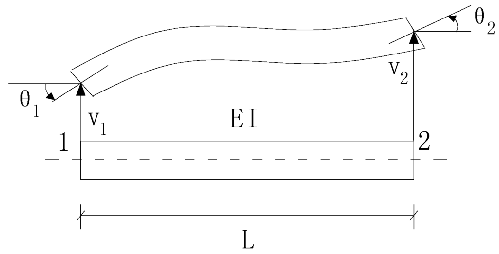 Now we begin to discuss the properties of the characteristic force and deflection for structural elements. For convenience, the beam element is employed to illustrate these substantive features. Figure 1 presents a Bernoulli-Euler plane beam element with two nodes giving four DOFs, whose stiffness matrix and nodal displacement vector in local co-ordinates are as follows: