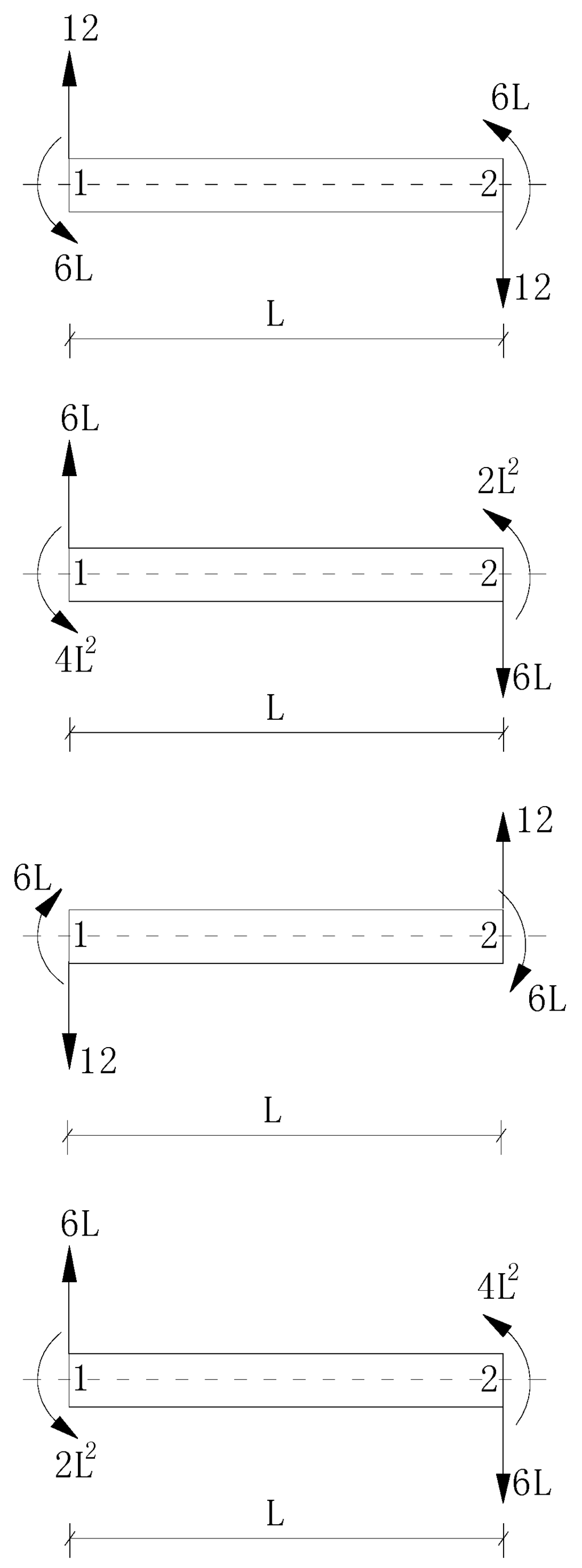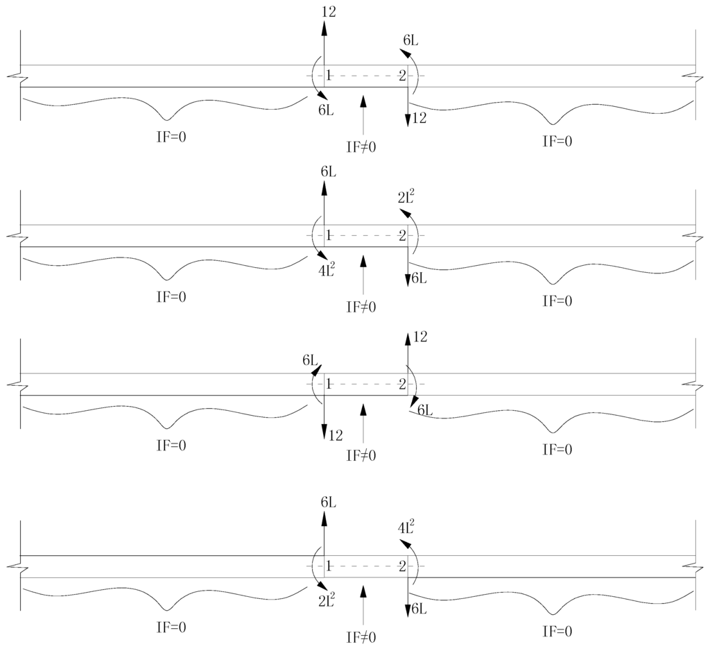 The four column vectors of Ke in Equation (18) are the characteristic forces for the Bernoulli-Euler plane beam element in local co-ordinates. Figure 2 shows the corresponding load configurations of these characteristic forces.