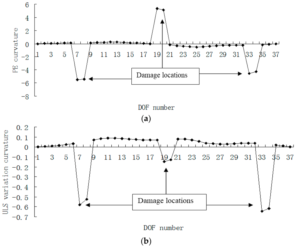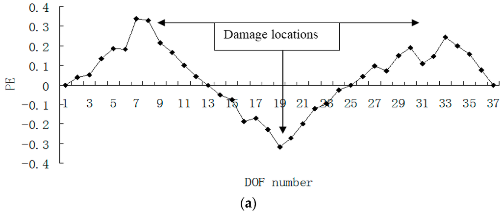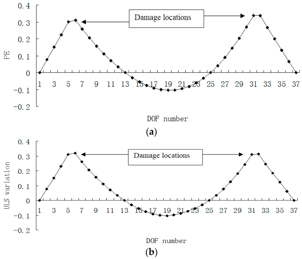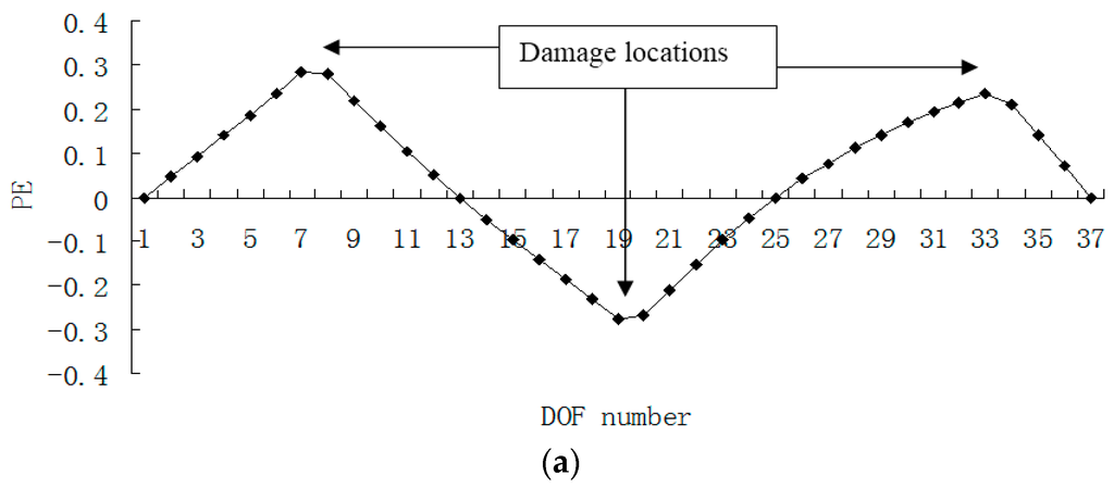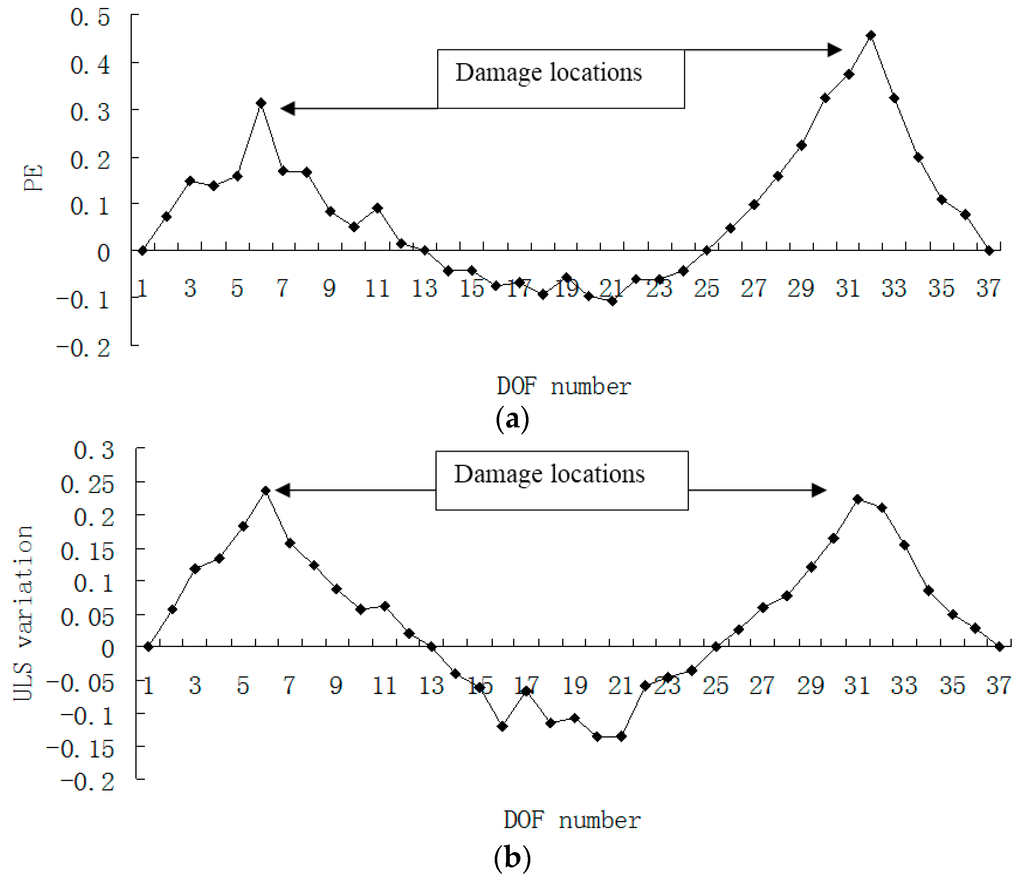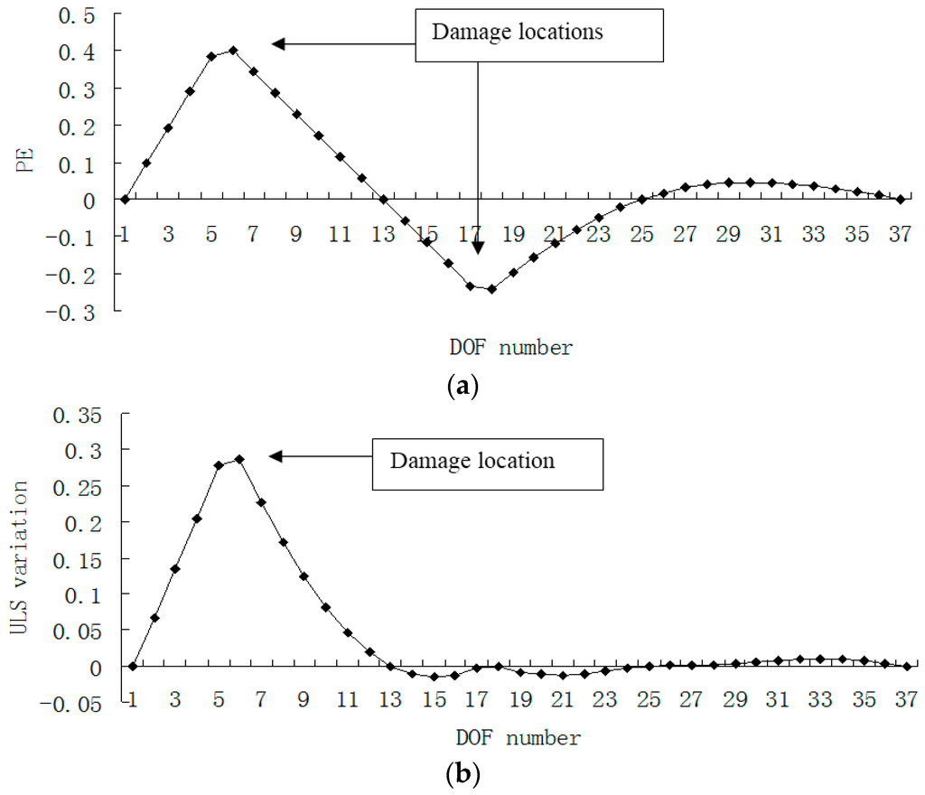 Figure 15, Figure 16, Figure 17 and Figure 18 presented the damage localization results for damage case 5 using the exact modal data and the data with 3% noise, respectively. From Figure 15a and Figure 16a, one can see that the damaged elements 7, 19 and 33 were clearly identified by PE and PE curvature. From Figure 15b, the ULS variation method fails to detect the damaged element 19. It can be concluded that the PE algorithm can precisely identify multiple defect locations, whereas the ULS method occasionally missed multiple damage locations.