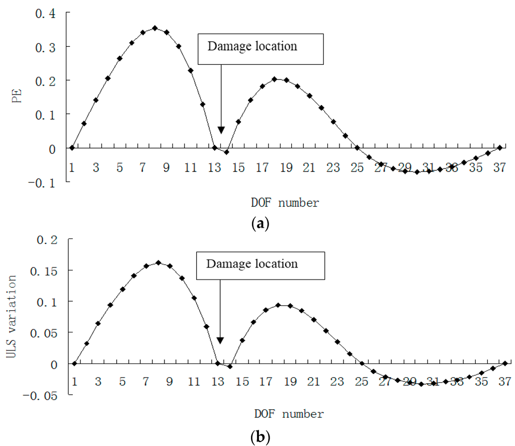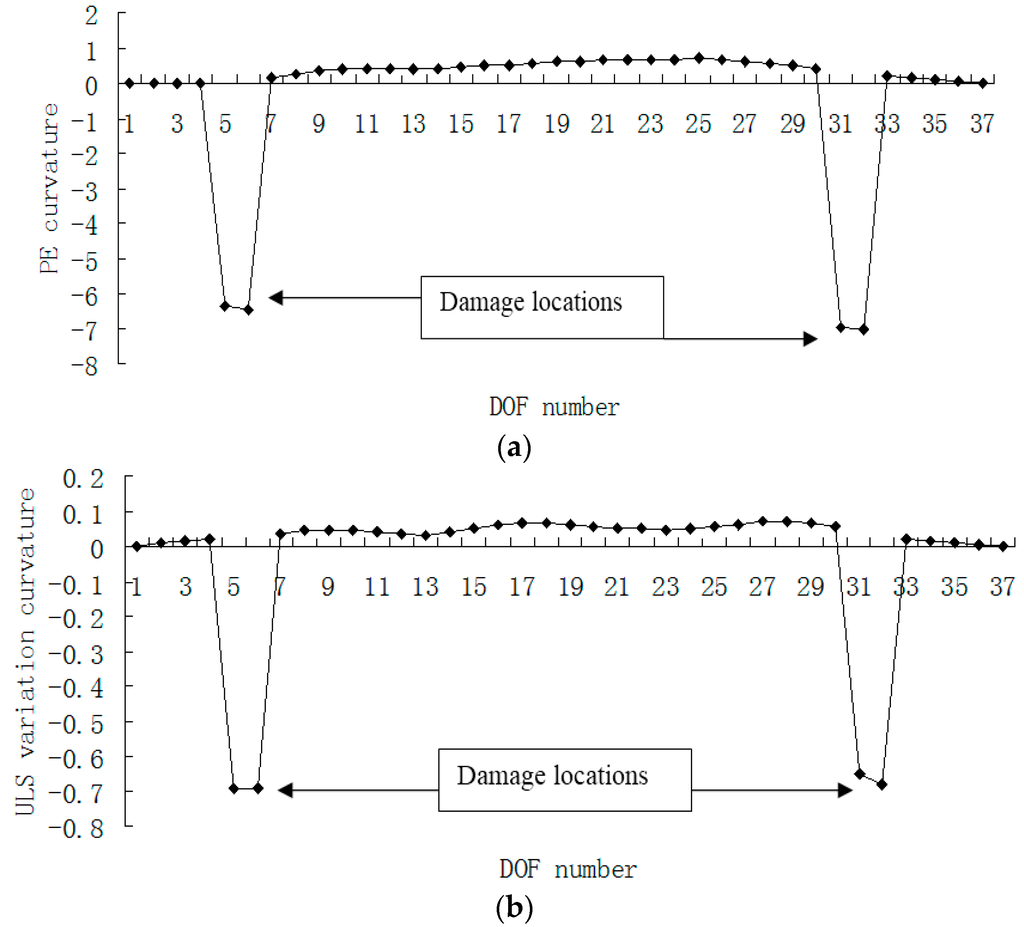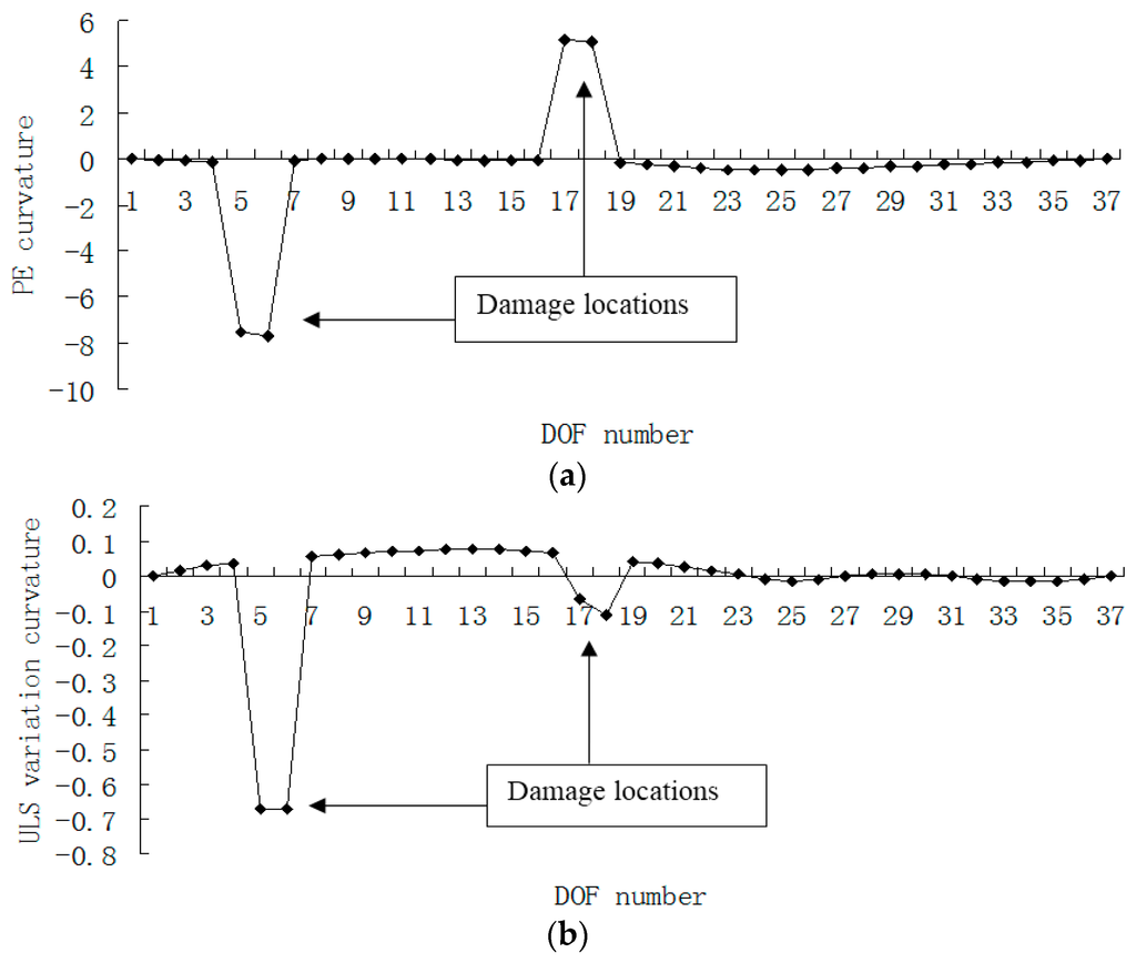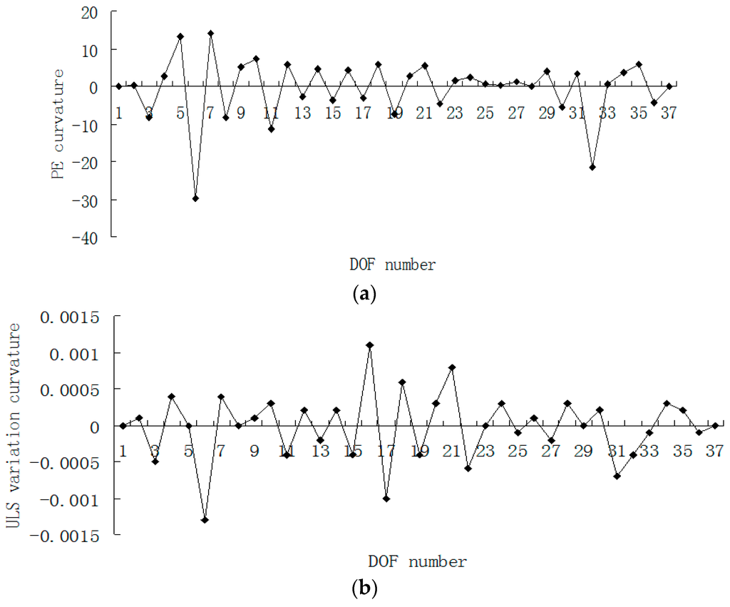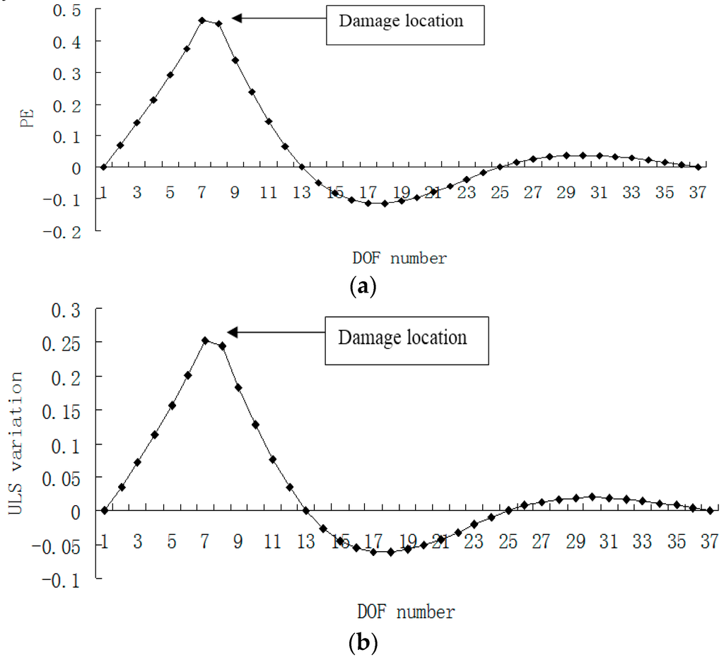 Figure 15, Figure 16, Figure 17 and Figure 18 presented the damage localization results for damage case 5 using the exact modal data and the data with 3% noise, respectively. From Figure 15a and Figure 16a, one can see that the damaged elements 7, 19 and 33 were clearly identified by PE and PE curvature. From Figure 15b, the ULS variation method fails to detect the damaged element 19. It can be concluded that the PE algorithm can precisely identify multiple defect locations, whereas the ULS method occasionally missed multiple damage locations.