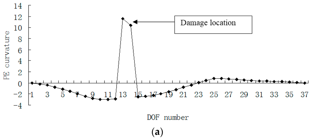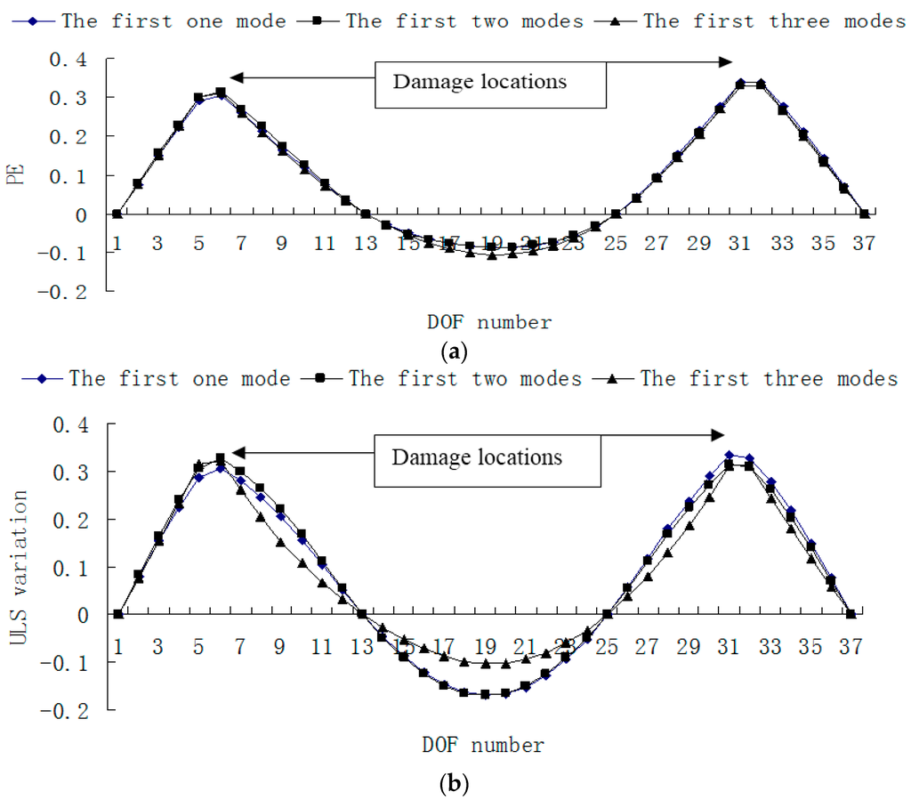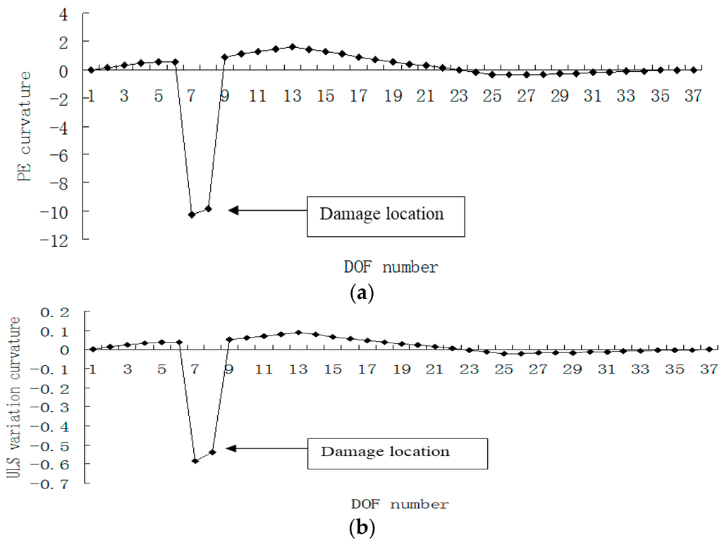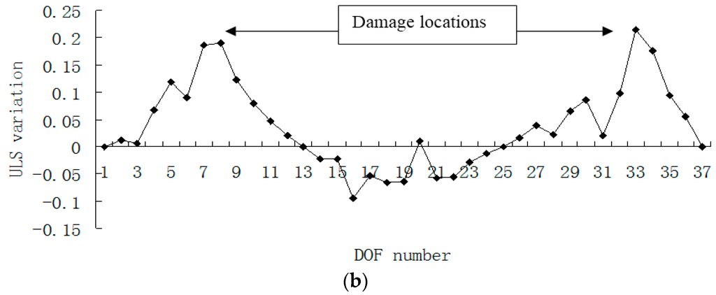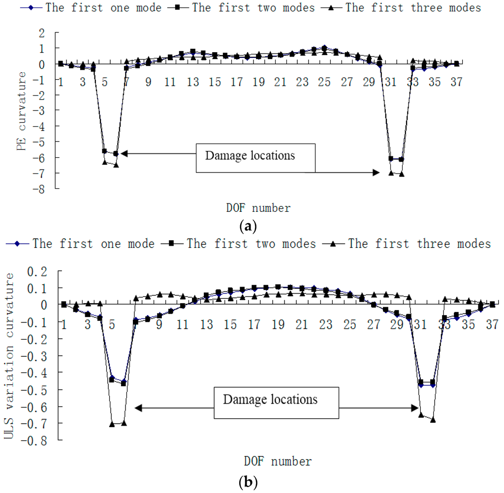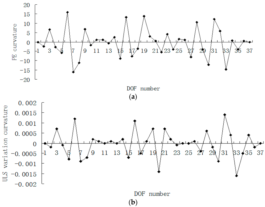 Figure 15, Figure 16, Figure 17 and Figure 18 presented the damage localization results for damage case 5 using the exact modal data and the data with 3% noise, respectively. From Figure 15a and Figure 16a, one can see that the damaged elements 7, 19 and 33 were clearly identified by PE and PE curvature. From Figure 15b, the ULS variation method fails to detect the damaged element 19. It can be concluded that the PE algorithm can precisely identify multiple defect locations, whereas the ULS method occasionally missed multiple damage locations.