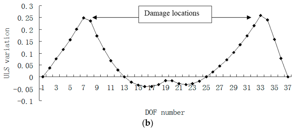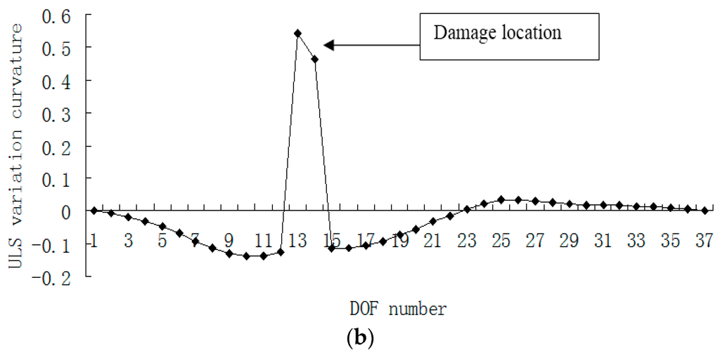 Using the exact data without noise, the principal eigenvector (PE) of modal flexibility change and the ULS variation for damage scenario 1 are plotted in Figure 5a,b, respectively. Accordingly, the PE curvature and the ULS variation curvature for the case of damage scenario 1 are plotted in Figure 6a,b, respectively.