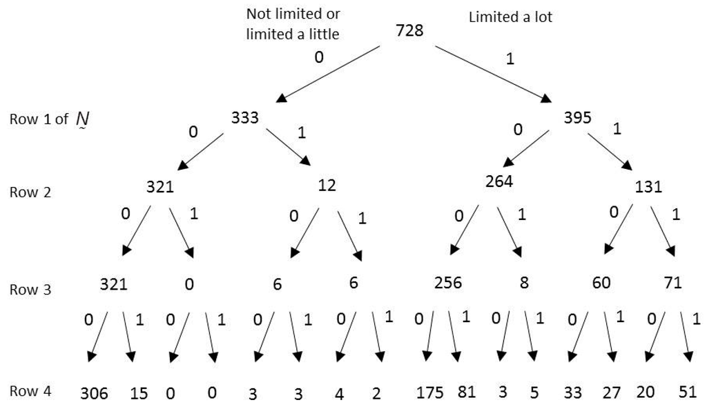 Figure 1 is an illustrative tree representation of based on the geriatric assessment survey. Respondents were asked if they felt limited in 4 different functional activities and their responses were coded ‘0’ or ‘1’ as shown. The geriatric assessment survey will be discussed at length in Section 6 of this paper. The entries for the first row of would be 333 and 395, appearing in columns 1 and 2, as the number of respondents who answered ‘0’ and ‘1’, respectively, to the first questions. The filled in entries of the second row of would be 321, 12, 264 and 131, appearing in the first four columns, respectively. The first two entries, 321 and 12, are the partition of 333 corresponding to ‘0’ and ‘1’ answers to the second question among the 333 respondents who said ‘0’ to the first question. Similarly, the entries 264 and 131 are the partition of 395 corresponding to ‘0’ and ‘1’ answers to the second question among the 395 respondents who said ‘1’ to the first question. The initialization section of the algorithm in the appendix shows the steps involved for building . The basic idea is to establish counters for each node in the tree and increment the counters as each survey traverses the tree.