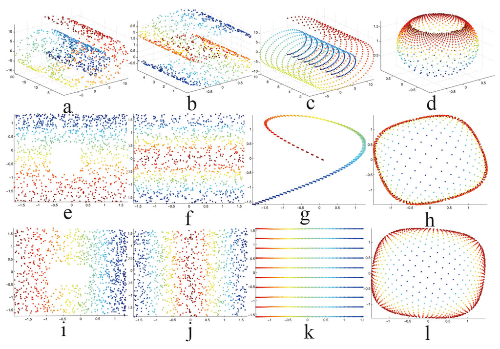 Embeddings of the synthetic 2D manifolds. (a) Swiss Roll with a hole; (b) S-curve; (c) Uniform Swiss Roll; (d) Punched Sphere. The first row shows the four manifolds, and the second (e–h) and third rows; (i–l) are the corresponding embedding results obtained by the original HLLE and our reformulated HLLE respectively. In all experiments, the number of data samples is 1000 and the number of nearest neighbors is fixed to .