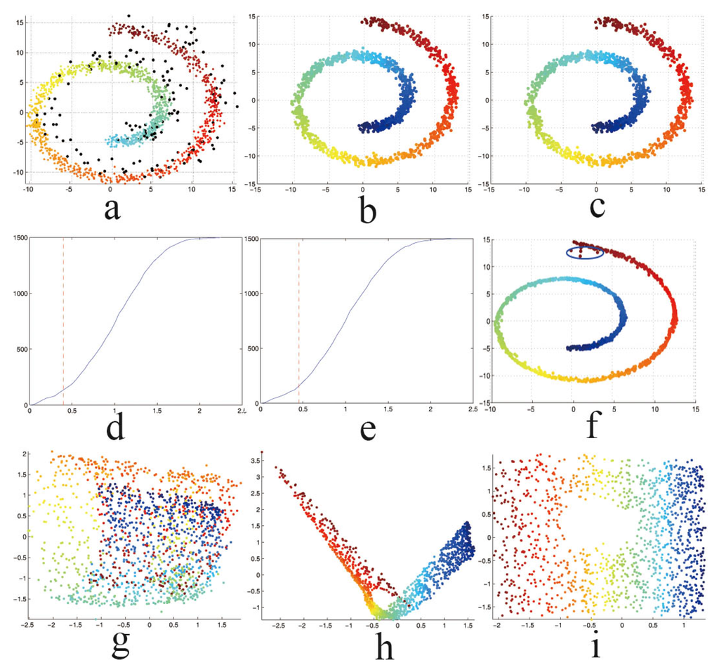 Results of HLLE, RLLE and RHLLE applied to the “Swiss roll with a hole” dataset with the existence of outliers and noises. (a) Dataset with outliers and noises; (b) Results of outlier removal using RLLE’s method; (c) Results of outlier removal using RHLLE’s method; (d) Cumulative distributions of reliability scores computed by the RLLE’s method; (e) Cumulative distributions of reliability scores computed by the RHLLE’s method; (f) Results of noise reduction with one iteration of local smoothing; (g) HLLE result; (h) RLLE result; (i) RHLLE result.