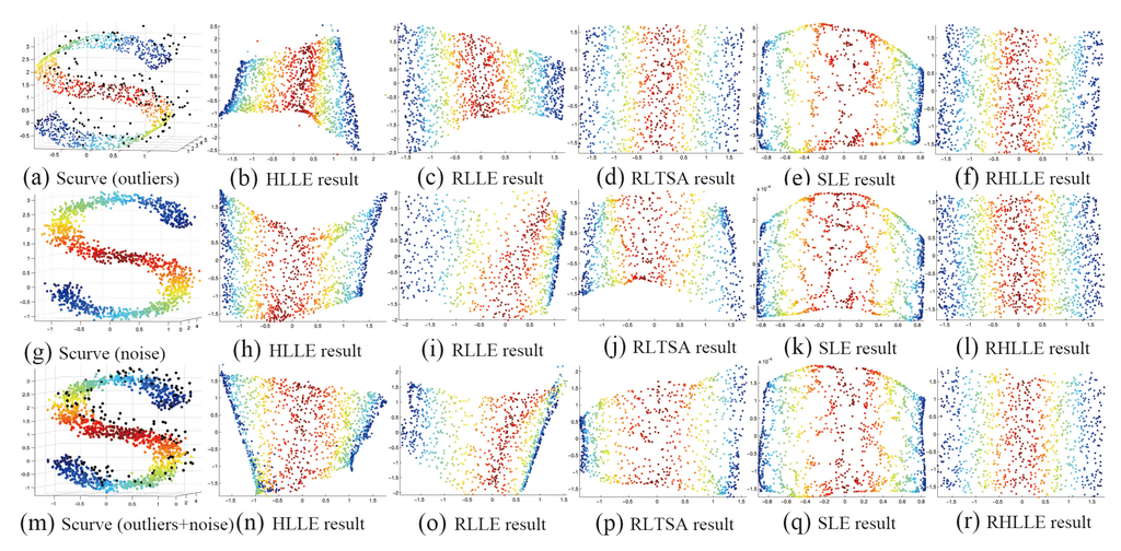 We compare our RHLLE with HLLE [], RLLE [], RLTSA [] and SLE [] on these datasets. The performance of these algorithms can be seen by comparing the coloring of the data points, the smoothness and the shape of the projection coordinates with their original manifolds. As we can see from Figure 3, Figure 4 and Figure 5, the traditional HLLE algorithm fails to recover the underlying manifold structure when there exist either or both outliers and noise-corrupted points (see Figure 3(b,h and n), Figure 4(b,h and n) and Figure 5(b,h and n). RLLE and RLTSA can recover the manifold structure when there are outliers (see Figure 3(c,d), Figure 4(c,d) and Figure 5(c,d)). However, RLLE and RLTSA cannot recover the manifold structure well when there exist large amounts of noise-corrupted points or both outliers and noise-corrupted points (see Figure 3(i,j,o and p), Figure 4(i,j,o and p) and Figure 5(i,j,o and p)). SLE can usually preserve the local geometry of the data manifolds in the embedding space when there exist large amounts of noise-corrupted points (see Figure 3k, Figure 4k and Figure 5k)). However, SLE cannot preserve the local geometry of the data manifolds well in the embedding space when there exist outliers or both outliers and noise-corrupted points (see Figure 3(e,q), Figure 4(e,q) and Figure 5(e,q)). The results in Figure 3, Figure 4 and Figure 5 show that only our RHLLE algorithm can accurately unfold and recover the original manifolds in the presence of either or both outliers and noise-corrupted points (see Figure 3(f,l and r), Figure 4(f,l and r) and Figure 5(f,l and r)). From the above experiments we can conclude that: (1) our RHLLE algorithm can significantly improve the performance of the Hessian LLE algorithm on the outliers and noise-corrupted data; (2) our RHLLE algorithm performs the best among the five methods on the synthetic datasets.