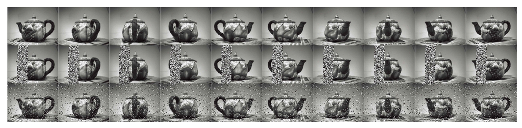 In order to add some outliers to the original image dataset, we first randomly select of the images and for each selected image we replace a rectangular block of the image (about pixels) with independent and identically-distributed samples from a uniform distribution. The location of the corrupt rectangular block is unknown to the algorithm. In order to generate noise-corrupted images, we first randomly select of the images and for each selected image we corrupt of randomly-chosen pixels by replacing their values with independent and identically-distributed samples from a uniform distribution. The corrupted pixels are randomly-chosen for each image, and the locations are unknown to the algorithm. Figure 6 shows 10 original teapot images, their corresponding outlier images and noise-corrupted images.