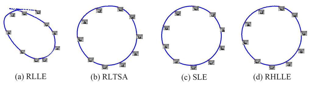 The low-dimensional embeddings in of RLLE, RLTSA, SLE and RHLLE are shown in Figure 7. For completeness and to provide a baseline, the results on the original data without being corrupted are shown in Figure 8. In the embeddings we uniformly mark about of the points with red circles and attach their corresponding training images. In the experiment, we set the number of nearest neighbors k to 10. Figure 7 reveals the following points: (1) RLTSA and RHLLE perform better than RLLE and SLE when there are outliers in the image set (see Figure 7a–d); (2) SLE and RHLLE perform better than RLLE and RLTSA when there exist large amounts of noise-corrupted images (see Figure 7e–h); (3) RLLE and RLTSA perform even worse and fail to recover the underlying manifold structure when there exist both outliers and large amounts of noise-corrupted images in the teapot dataset (see Figure 7i,j); (4) The 2D embedding results obtained by our RHLLE are shown in Figure 7d,h and l. Along the circle we can see a clear and smooth change in the orientations of the teapot, which means that our RHLLE successfully uncovers the geometric structure of the image dataset. Therefore, our RHLLE is superior to RLLE, RLTSA and SLE in revealing the underlying manifold when there are either or both outliers and noise-corrupted images in the teapot dataset.