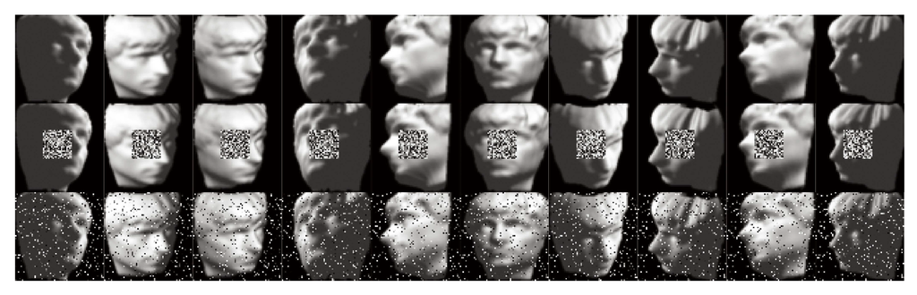 Besides the teapot image dataset, we also conduct experiments on the ISOFACE [] dataset which is another benchmark dataset used by many manifold learning algorithms. This dataset contains 698 images of a 3D human head, which are collected under different poses and lighting directions. The resolution of each image is 64 × 64 and each image is represented as a 4096-dimensional vector. The intrinsic degrees of freedom are the horizontal rotation, vertical rotation and lighting direction. In order to add some outliers to the original face images, we first randomly select of the images and for each selected face image we replace a square block of the image (about 20% pixels) with independent and identically-distributed samples from a uniform distribution. The location of the corrupt square block is unknown to the computer. In order to generate noise-corrupted face images, we first randomly select of the face images and for each selected image we corrupt of randomly-chosen pixels by replacing their values with independent and identically-distributed samples from a uniform distribution. The corrupted pixels are randomly-chosen for each face image, and the locations are unknown to the algorithm. Figure 9 shows 10 original face images, their corresponding outlier images and noise-corrupted images.