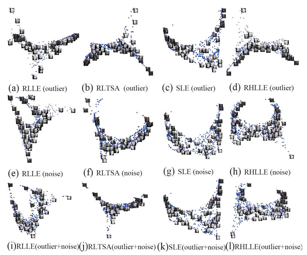At the end of this subsection, we compare our RHLLE algorithm to the RLLE [] and RLTSA [] algorithms. All these methods develop the corresponding weighted cost function instead of the original one to reduce the undesirable effect of outliers or noises. However, there are three significant differences among them. Firstly, both RLLE and RLTSA use RPCA technique to identify the outliers, while our RHLLE develops a fast algorithm to identify the outliers. Our proposed fast algorithm is robust and can save much time, especially for high-dimensional data. Secondly, our RHLLE employs the local smoothing technique to reduce the influence of small noises, while the RLLE and RLTSA algorithms will fail when the dataset has large amounts of small noises. Furthermore, RLLE incorporates the reliability score of each point as weight into the reconstruction function to further reduce the influence of outliers. Whereas in RLTSA and our RHLLE, the undesirable effect of outliers and noise is further reduced by incorporating the total reliability scores of each reliable local patch as weight into the global functional.