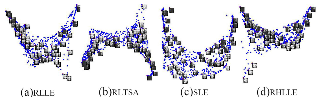 The 2D embedding results of RLLE, RLTSA, SLE and RHLLE are shown in Figure 10. For completeness and to provide a baseline, the results on the original data without being corrupted are shown in Figure 11. In the embedding we randomly mark about points with red circles and attach their corresponding training images. In the experiment, we set the number of nearest neighbors k to 15. Figure 10 reveals several interesting observations: (1) For the outliers situation, the embedding result of RLLE and SLE show that the orientations of the face change smoothly along the horizontal direction and the orientations of the face change from down to up along the vertical direction (see Figure 10a,c). The 2-D embedding results of RLTSA and RHLLE show that the poses and the light of the face images vary smoothly along the horizontal direction and the vertical direction respectively (see Figure 10b,d). Thus, all methods can approximately discover the intrinsic structures of this dataset with outliers; (2) For the noise-corrupted situation, the embedding results of RLLE and RLTSA are severely compressed and the changes in face rotation are not obvious (see Figure 10e and the right-hand side of Figure 10f). Therefore, RLLE and RLTSA cannot recover the underlying manifold structure well when there exist large amounts of noise-corrupted images; (3) For the outliers plus noise-corrupted situation, RLLE and RLTSA perform even worse (see Figure 10i,j), while SLE and our RHLLE successfully reveal the underlying manifold of the ISOFACE dataset with both outliers and noise-corrupted images (see Figure 10k,l).