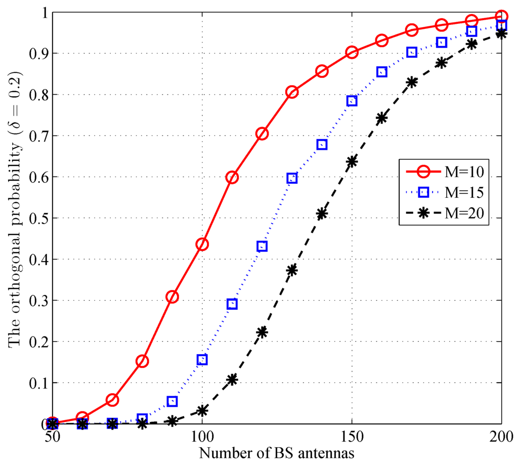 In this section, we first evaluate the asymptotical orthogonality of the channels between the BS and its served users, which reflects the computational efficiency of MRDS. Figure 1 shows the orthogonal probability () versus the number of BS antennas with , 15, and 20. The orthogonal probability gets larger with the increase of the number of BS antennas or with the decrease of the user amounts.