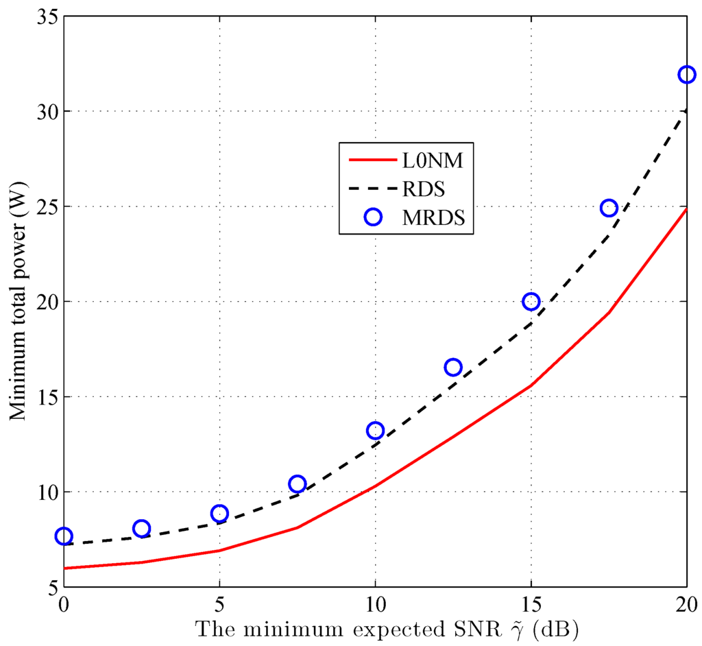 Figure 2 shows the average minimal total power consumption calculated by our methods versus the SNR constrains when . The average minimal power consumption gets larger when the SNR requirement becomes more strictly. The difference of the average minimum total consumed power is minor between the RDS algorithm and the MRDS algorithm. The L0NM algorithm significantly outperforms the RDS algorithm, because it does not remove antennas randomly in each step as done by the RDS algorithm.