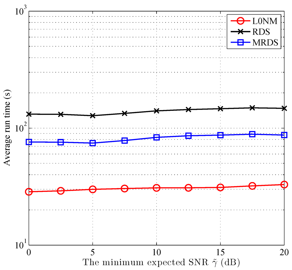 Figure 3 evaluates the average run time of our algorithms versus the SNR constrains when . The codes are executed on a 64-bit desktop with 8 Gbyte RAM and Intel CORE i5 using YALMIP as the Matlab package. It can be seen that, either the MRDS algorithm or the L0NM algorithm provides noticeable improvement compared with the RDS algorithm in terms of the average run time.