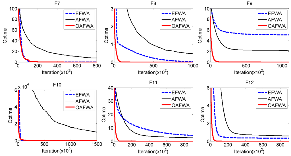 Figure 2 shows that OAFWA results in a global optimum for all twelve functions and with fast convergence. However, the alternative EFWA methods do not always locate the global optimum solutions. These include EFWA for F9 and F11. AFWA is the worst among the three algorithms. It is bad for a majority of functions. Thus, OAFWA is the best one in terms of solution accuracy.