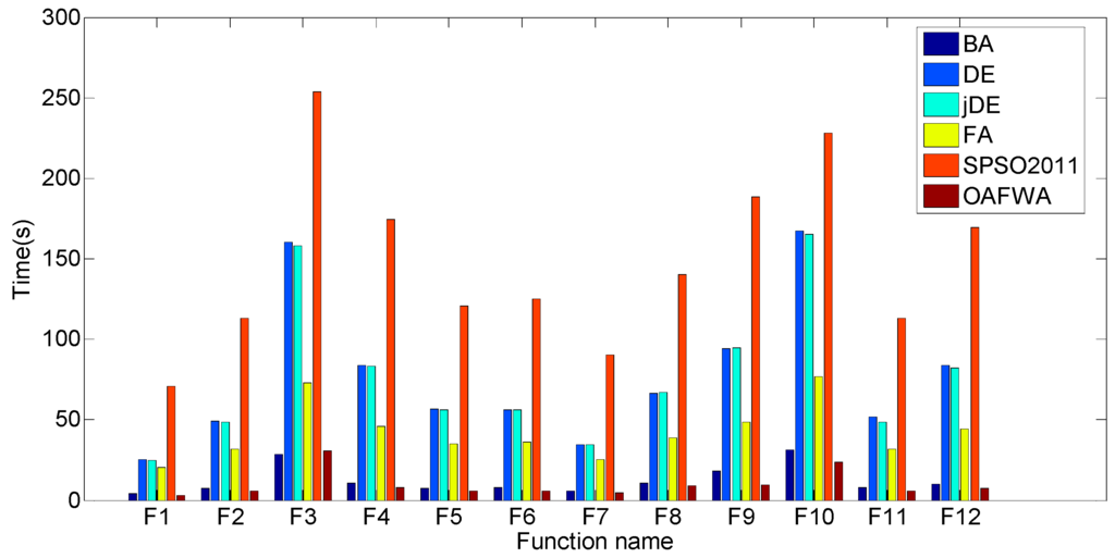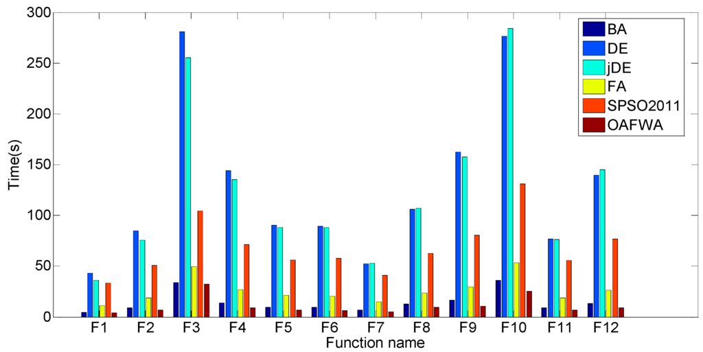 Figure 3 shows that the runtime cost of DE is the most expensive among the six algorithms, except for F7, F8, F10, and F12. Figure 4 shows that the runtime cost of SPSO2011 is the most expensive among the six algorithms. The time cost of OAFWA is the least.