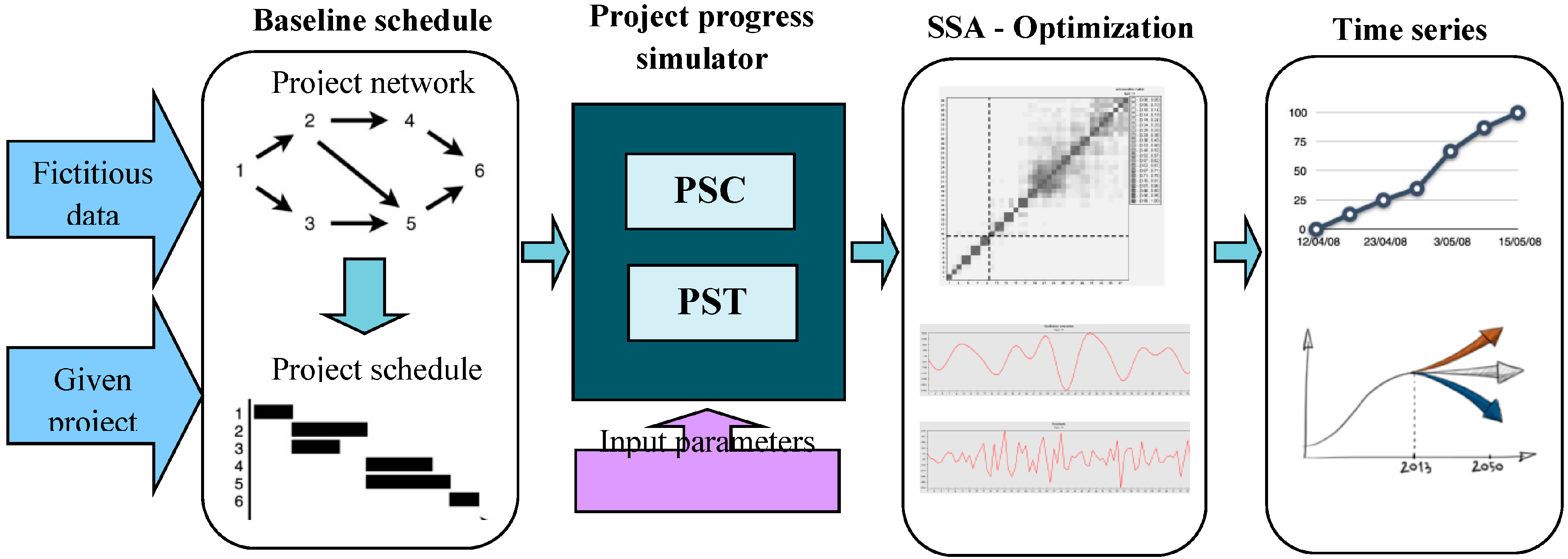 The methodology employed in the computational and conceptual experiment includes a new framework in order to generate project progress time series data, thereby introducing valuable information about projects and preparing an appropriate context for introducing new indices and formulae, varied experiments and further research. In the following subsections, the framework structure, its components and sources and why and how these sources (project progress simulator and SSA) can be used together in project control are explained.