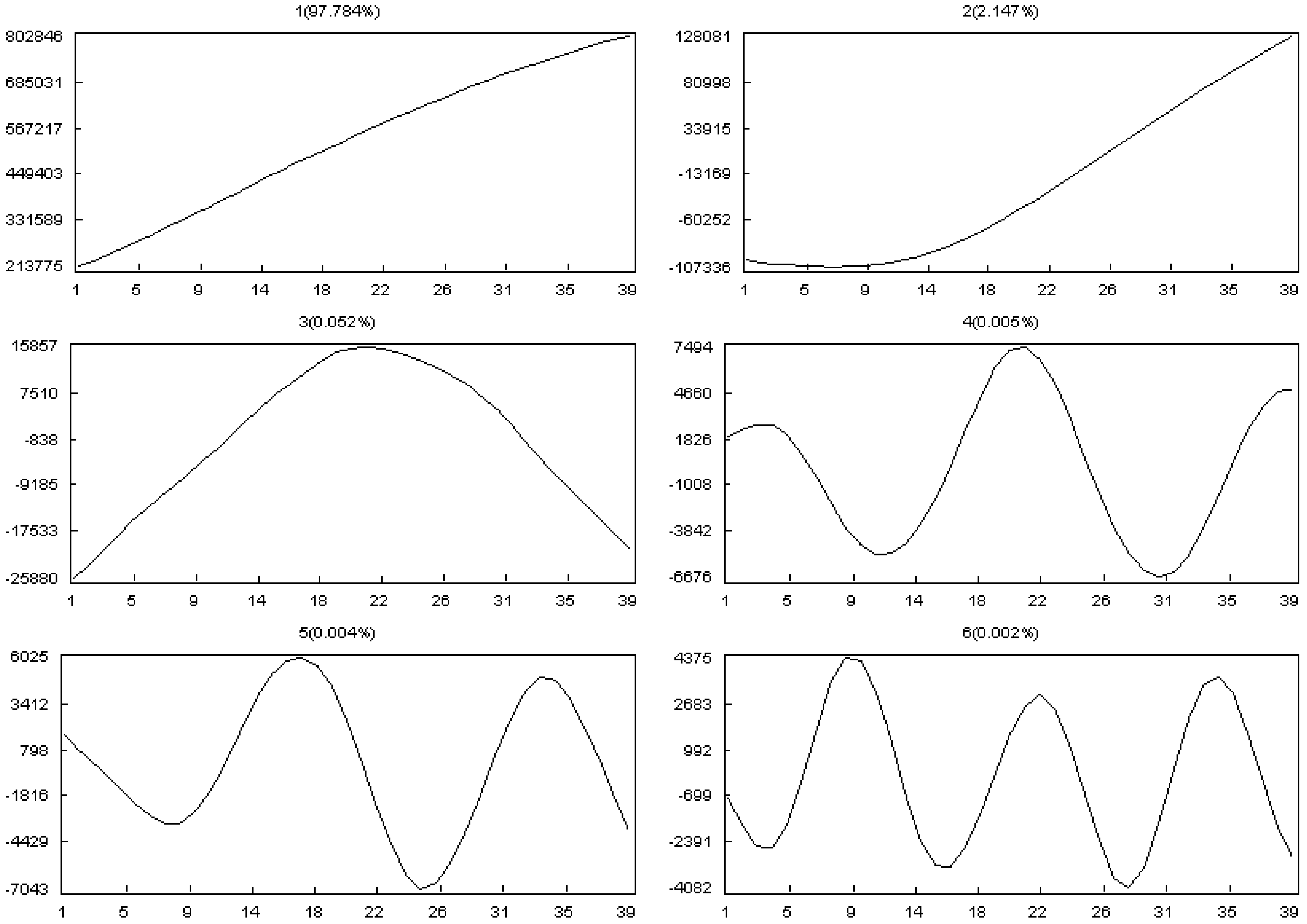 Figure 19 presents the first three eigentriple components of the resulting time series. The increase of this range results in a large fluctuation in the time series. This is apparent in the second and third principle components. However, the first principle component of the two series has approximately the same structure, and therefore, the two series have generally similar trends.