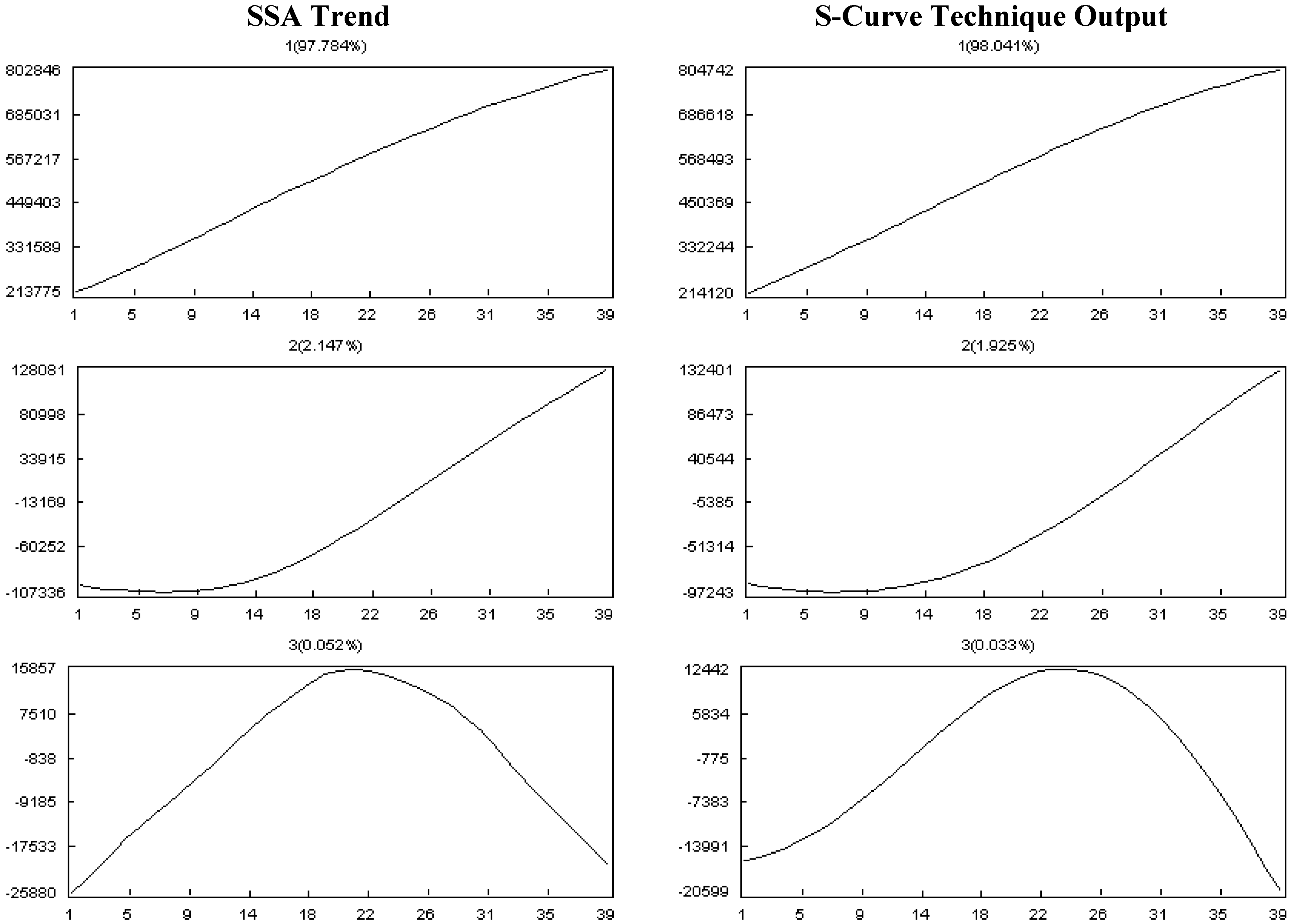 Table 1 presents the results of the two measures for SSA trend and the S-curve method with the generated time series. These two measures prove that the generated time series fit the actual trend better than the standard S-curve. Both RMSE values are less than 5% of the maximum member of each series that prove the validity of estimated time series. RMSE of the SSA trend is less than half of the S-curve one. Although the R measure is perfect in both, SSA is judged slightly better.