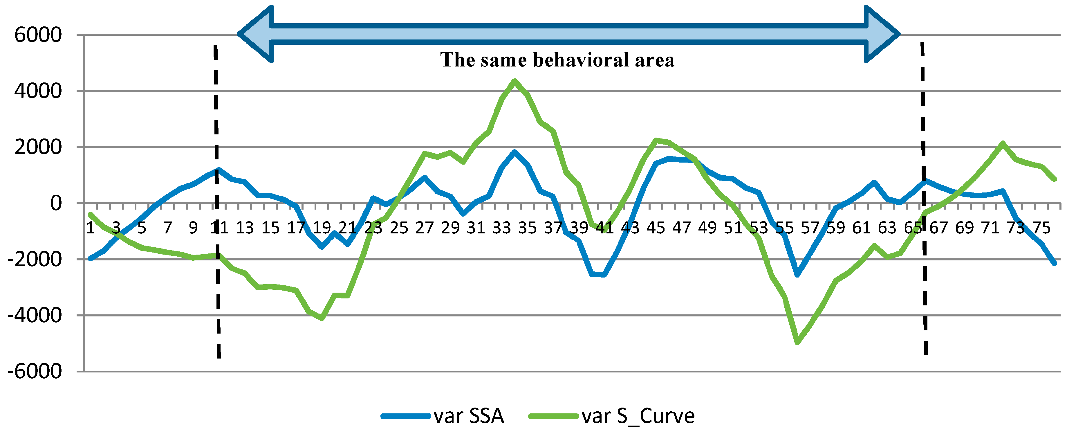The deviations between the trend of simulated results (SSA trend) and the S-curve technique with the first generated time series are shown in Figure 15. Clearly, these two deviations have the same behavior over time, with the exception of the start and end points. However, SSA results show a lower change range. Generally, these two deviations are near to one another, which results in the fact that the simulated fictitious results have a high accuracy and that this accuracy can be confirmed by similar tests on empirical data.